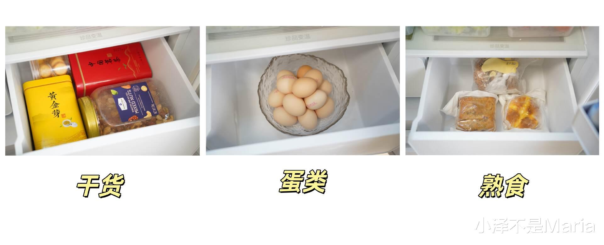 ▼右侧的珍品变温区功能就更强大了,尽管空间不算大,但功能却很实用,它能在干货,蛋类和熟食三档之间随意切换,通过微风道技术控制空间内的温度就能让变温区满足不同食材的存放条件。