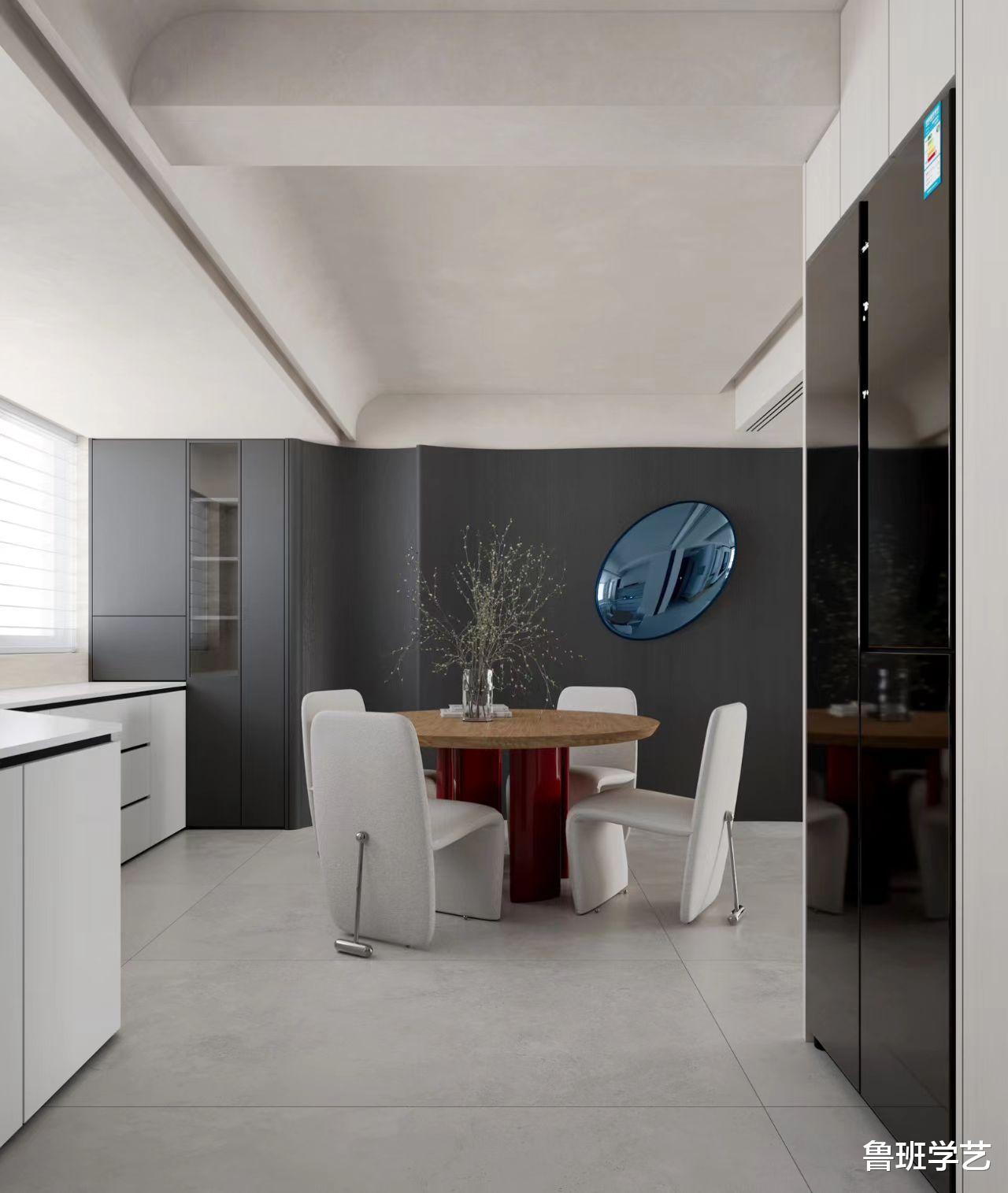 餐厅的搭建是本次改造的另一个创举。原有的户型中,餐厅区域并不明确。设计师利用客厅旁边的部分空间,通过巧妙的布局“凭空”创造出一个独立的用餐区。一张温润的木质餐桌,搭配几把舒适的餐椅,上方垂下一盏富有设计感的吊灯,一个温馨而独立的就餐场景便形成了。它与开放式的客厅既有联动,又互不干扰,让“食”与“居”的仪式感都得到了尊重。