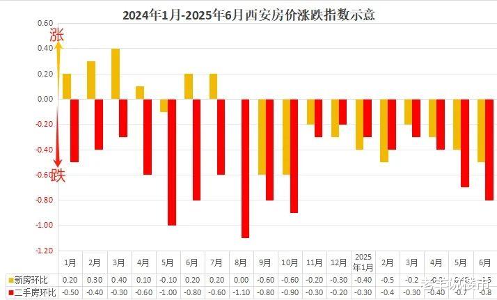 西安二手房环比下跌0.8%,比5月份(下跌0.7%)跌幅扩大0.1%,同比下跌6.6%,同期下跌6.8%。