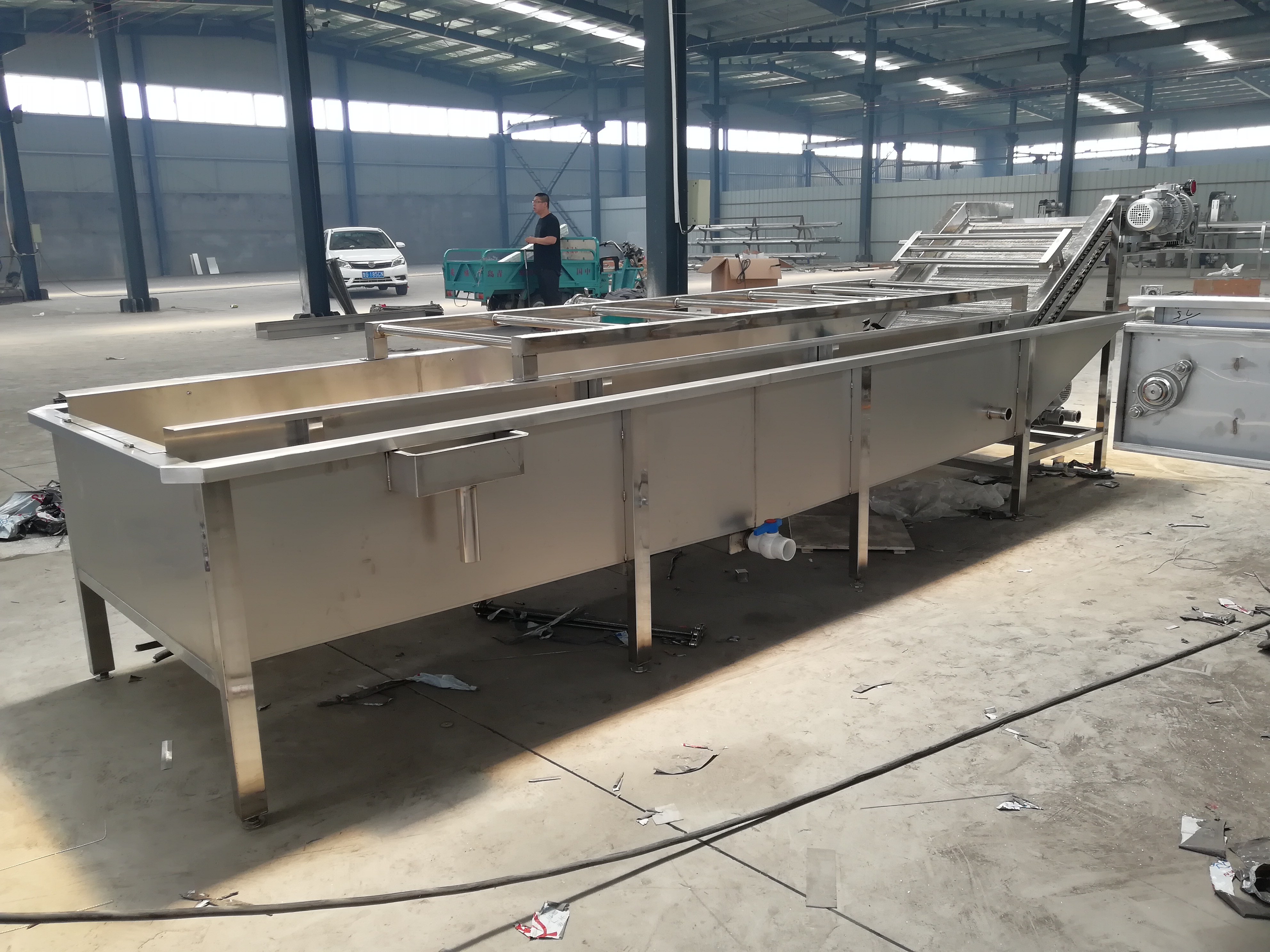 气泡清洗机利用高压风机风力或水泵的压力使水产生强烈翻转运动,物料进入水槽后,在高压水流和强劲气泡的作用下被充分翻滚,从而清洗掉表面的泥沙等附着物。漂浮物可以从溢流槽溢出,沉淀物从排污口排出,确保清洗后的物料不会受到二次污染。洗净的物料出水后,再经过喷淋清洗送至下道工序。