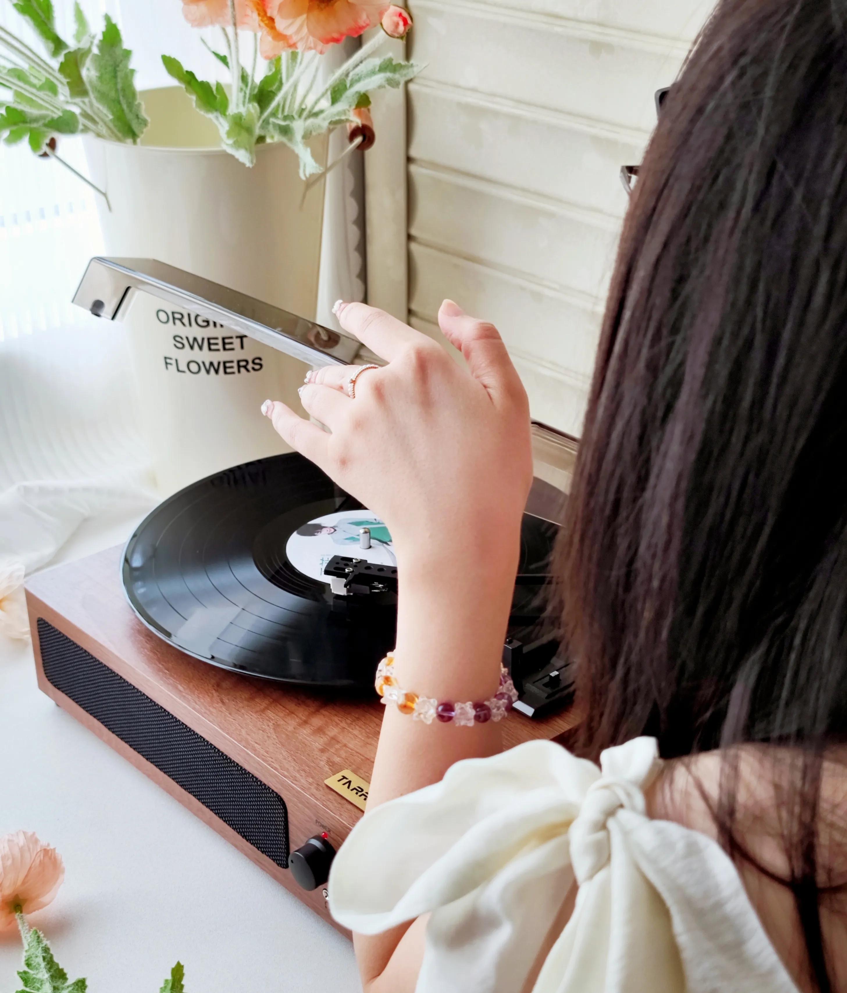同时,TE-01不仅是一台黑胶唱机,更是一位懂得变通的生活伙伴——RCA输出接口能连接专业音响系统;3.5mm耳机接口则为你保留私密的聆听时刻;而切换到蓝牙5.3模式后,它又化身为一台音质出众的蓝牙音箱,早晨用黑胶唤醒慵懒的周末,午后连上手机播放最新的播客,夜晚则让流媒体歌单延续这份音乐陪伴。