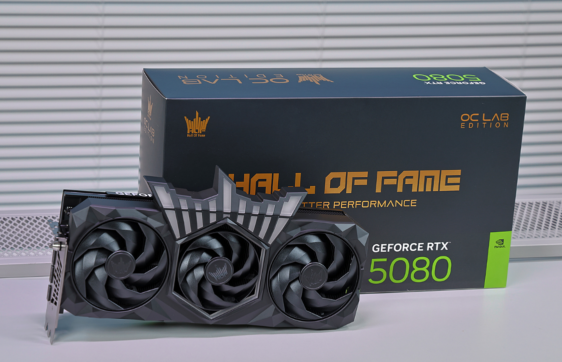 不论存储行情多么疯狂,显卡依旧是电脑八大件中最核心的配件,也决定着一台整机的性能上限。今儿主角,是这片影驰RTX 5080 HOF OC LAB 黑魂X 显卡。标志性的可拆式磁吸皇冠灯件支持ARGB神光同步,信仰与可玩性都拉满。全黑配色的显卡本体,钻石切割造型散热外壳,质感优秀。3颗黑色无光霜环风扇设计,同时中间风扇边缘及顶部灯带,搭配同样搭载ARGB灯效的皇冠设计,信仰拉满,不过需要竖装才能欣赏到。
