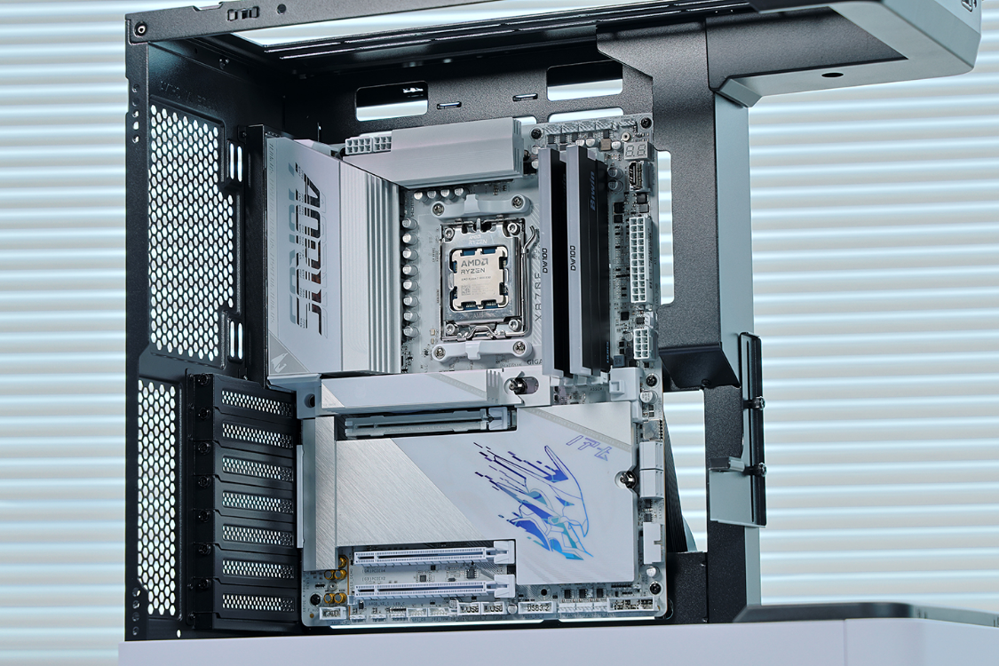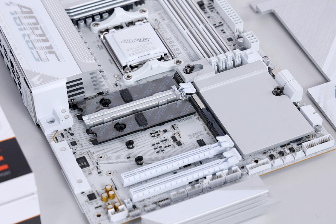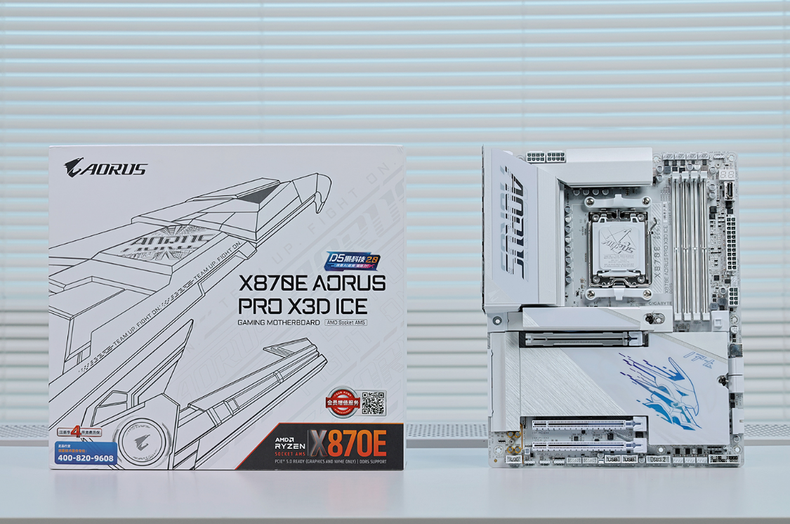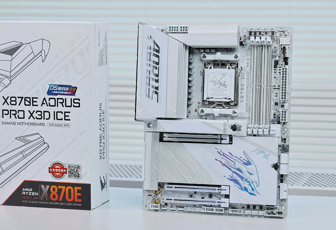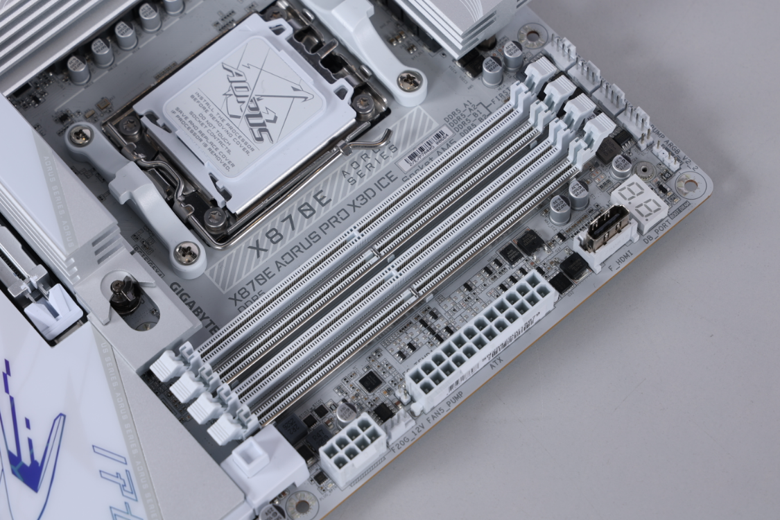 好马配好鞍,主板选配技嘉X870E Aorus Pro X3D ICE 电竞冰雕主板,ATX规格,配置方面采用豪华的18+2+2相数字供电设计。双8Pin外接供电搭配上内嵌2盎司铜板的8层服务器级低阻抗PCB板材,可以轻松拉满98X3D处理器性能。