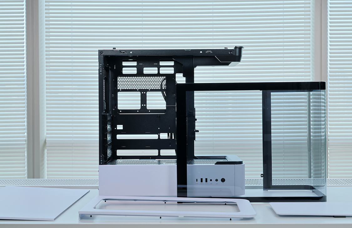 机箱整体采用模块化设计,左侧曲面玻璃侧板和右侧金属背板均有螺丝加固。兼容性方面,机箱支持ATX及以下规格主板,并支持背插ATX主板。显卡安装限长380mm,7槽PCIE插槽模块支持横竖切换,而且机箱还自带高度可调节的显卡支架。机箱风冷安装限高175,支持顶置360冷排,至多可安装7把120mm风扇。