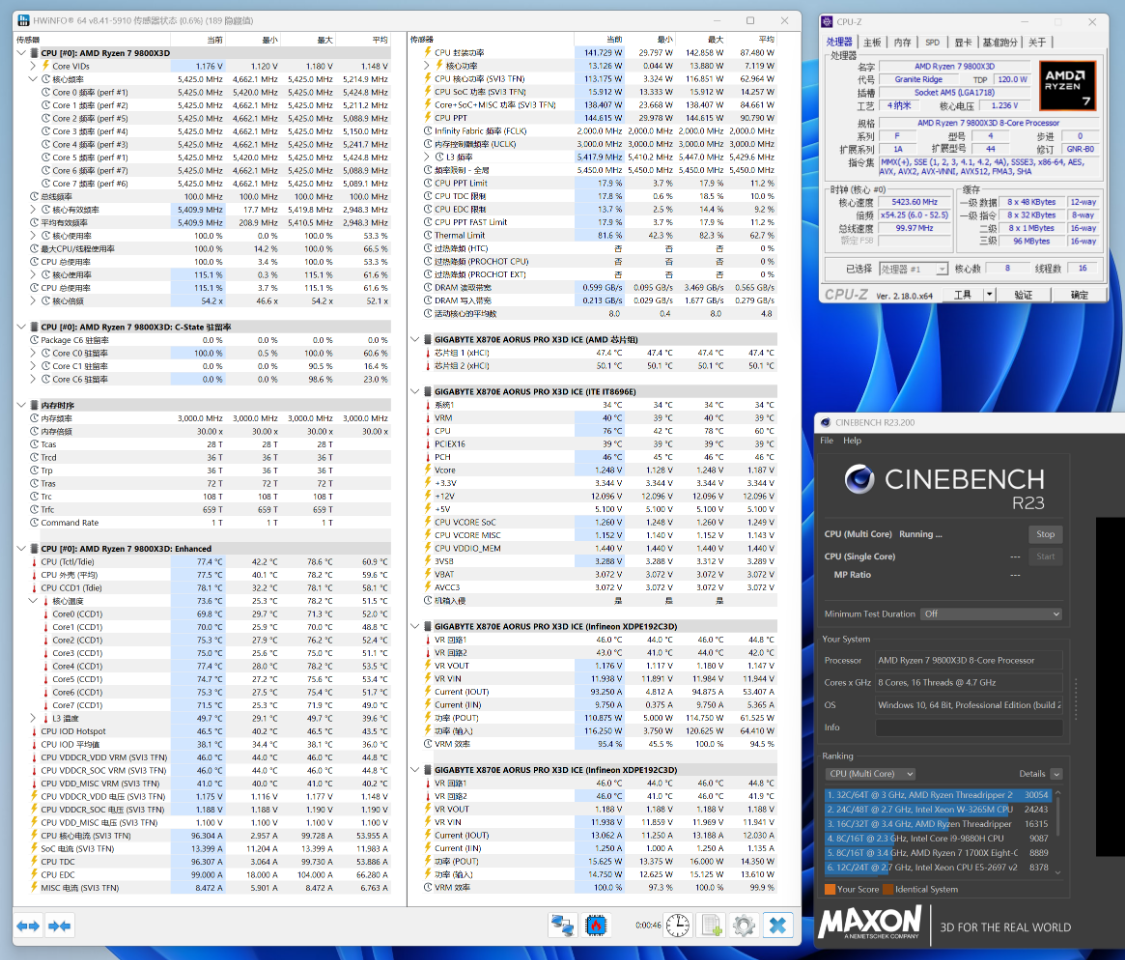 CineBench R23多核测试过程,CPU频率全程保持在5.4GHz,CPU外壳温度为77.5°,CPU封装功耗140W左右;