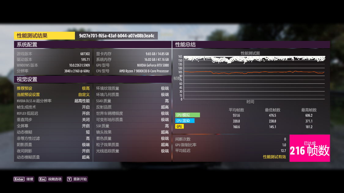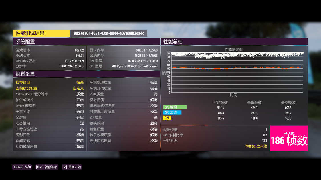 《极限竞速·地平线5》基准测试,4K分辨率下,极端画质,极端光追,开启DLSS 3.0并设为超高性能模式,游戏平均帧数216 FPS,DLSS为质量模式时,游戏平均帧数186 FPS;
