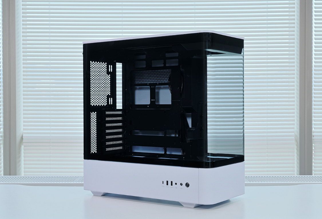 趣创HM1 ATX机箱,机箱三围:466*238*492mm。机箱采用独特的双曲面一体成型弧面玻璃侧板,无A柱的结构,整体视觉效果更加完美。白色外在和内里框架采用黑白撞色设计,整体颜值表现优秀。I/O面板位于机箱底部靠左,提供1个3.5mm音频口、2个USB 3.0、1个Type-C数据接口。