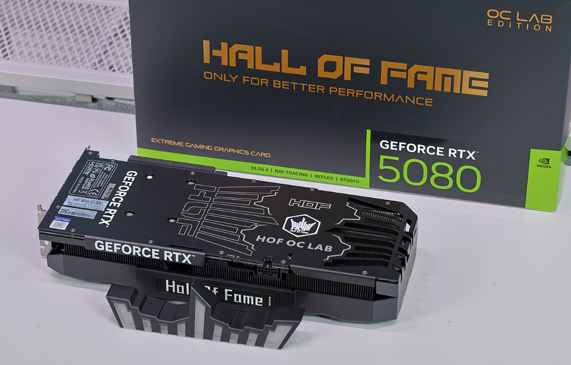 显卡背板两端有两个对称的皇冠造型,构成贯穿风道的背部开孔也成为了造型的一部分,设计感拉满。代表六边形全能战士的HOF LOGO灯元素位于金属背板中心,辨识度直接拉满。这一面,需要常规横置安装。