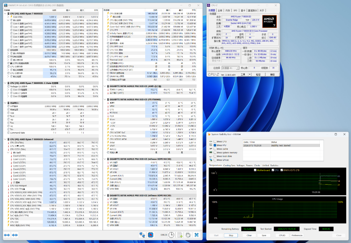 单烤FPU基准测试,CPU外壳温度83°左右,CPU封装功耗140W左右;