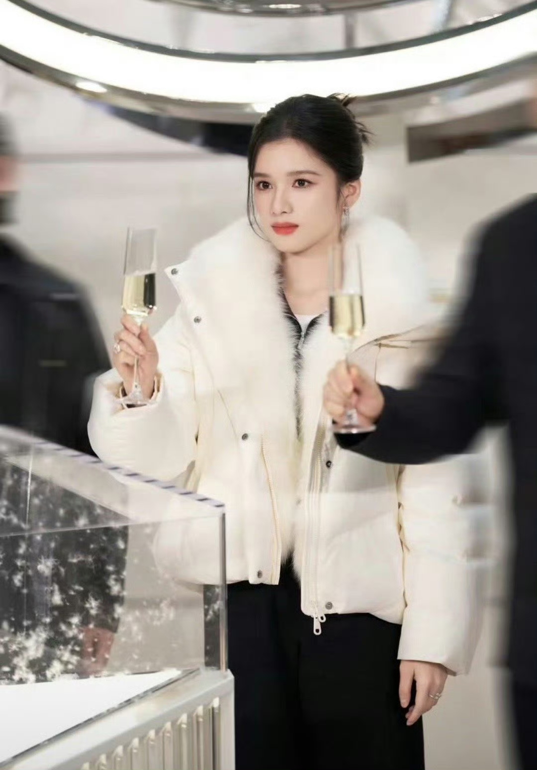 一身奶白色毛领羽绒服搭配黑色阔腿裤,简约穿搭尽显素雅气质,既具有冬日氛围感,又透着随性大方的时尚感。