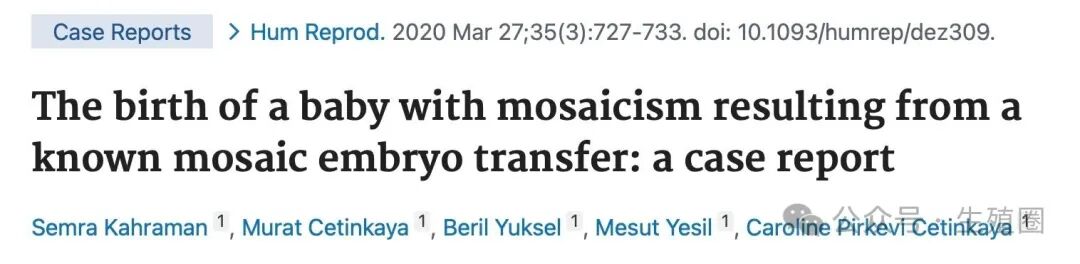 The birth of a baby with mosaicism resulting from a known mosaic embryo transfer: a case report. Hum Reprod. 2020 Mar 27;35(3):727-733. doi: 10.1093/humrep/dez309.