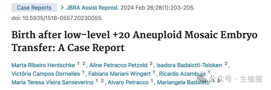 Birth after low-level +20 Aneuploid Mosaic Embryo Transfer: A Case Report. JBRA Assist Reprod. 2024 Feb 26;28(1):203-205. doi: 10.5935/1518-0557.20230055.