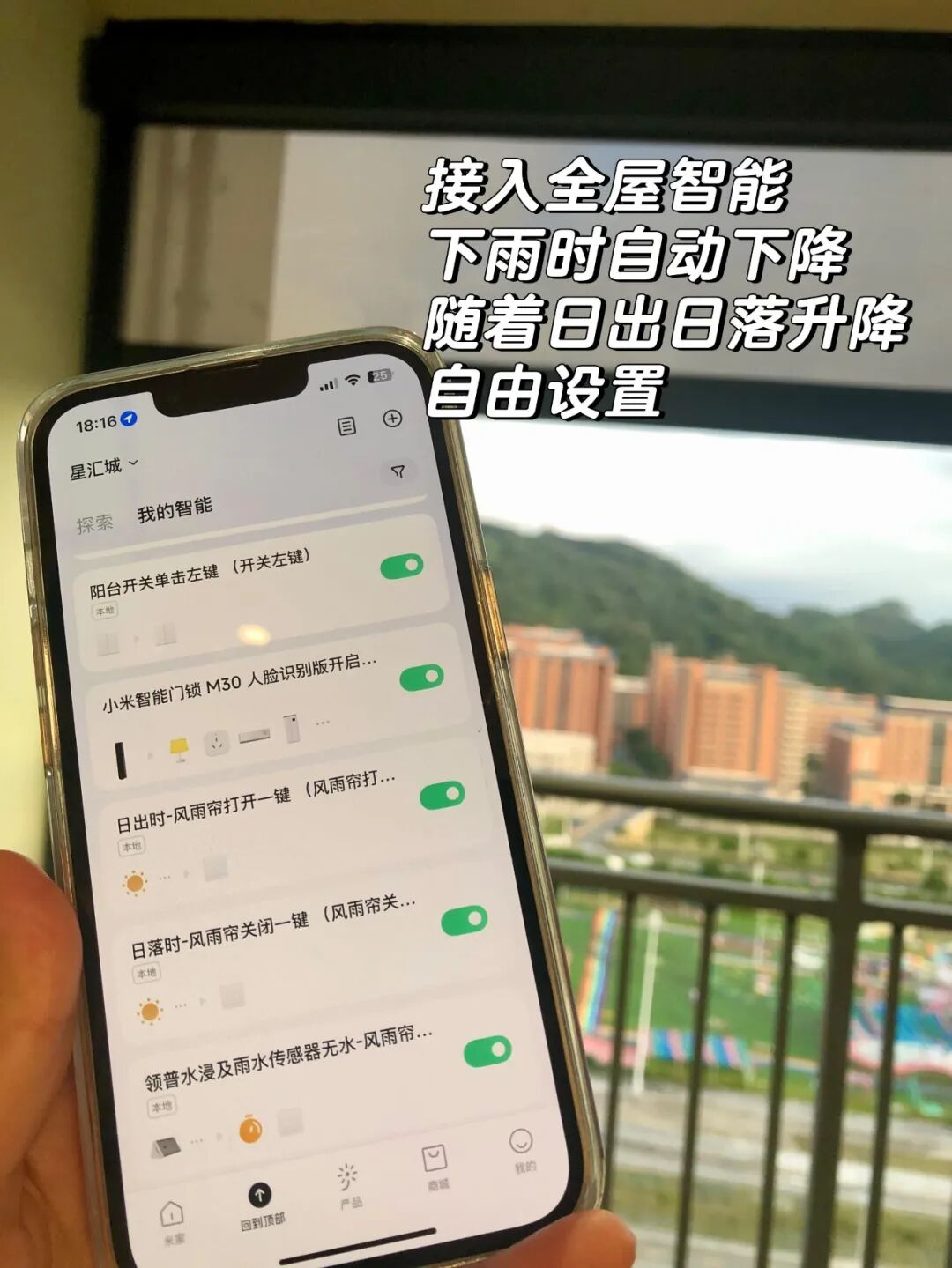 可以根据个人需要选择不同的材质,也有不同的透光度透气度可选,智能开关还能远程控制,大风大雨也不怕赶不回来家收衣服。而且它还可以当纱窗用夏天晚上防蚊虫,目前为止真的觉得实用美观,完全不后悔没封窗。