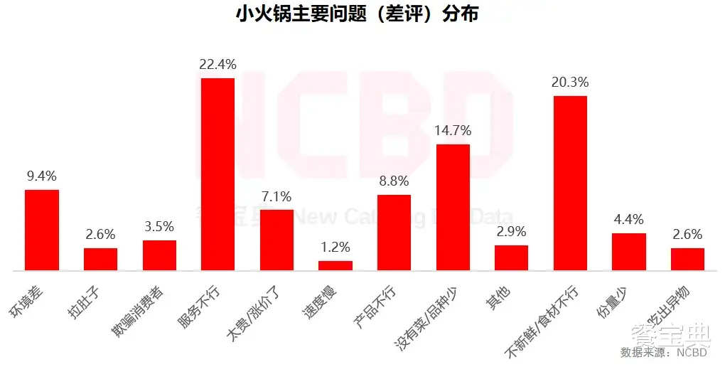 (5)从小火锅的差评分布来看,主要的问题集中在服务、食材、菜量、环境以及价格等方面,尤其是在食材方面问题较为普遍