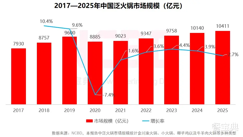 1、NCBD(餐宝典)数据显示,2025年中国泛火锅市场规模达10411亿元,同比增长2.7%,增幅继续降低