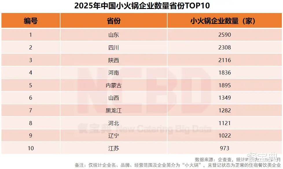 4、NCBD(餐宝典)数据显示,2025年新成立火锅企业数量最多的省是四川,数量占全国总量的13.0%;山东、贵州分别位居二、三位;TOP10省份新成立火锅企业占全国总量的59.2%,接近六成