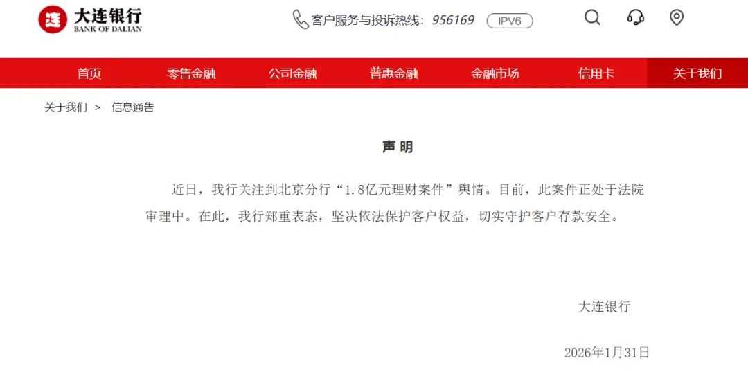 针对上述案件,1月31日,大连银行官网发布声明称,“近日,我行关注到北京分行‘1.8亿元理财案件’舆情。目前,此案件正处于法院审理中。在此,我行郑重表态,坚决依法保护客户权益,切实守护客户存款安全。”