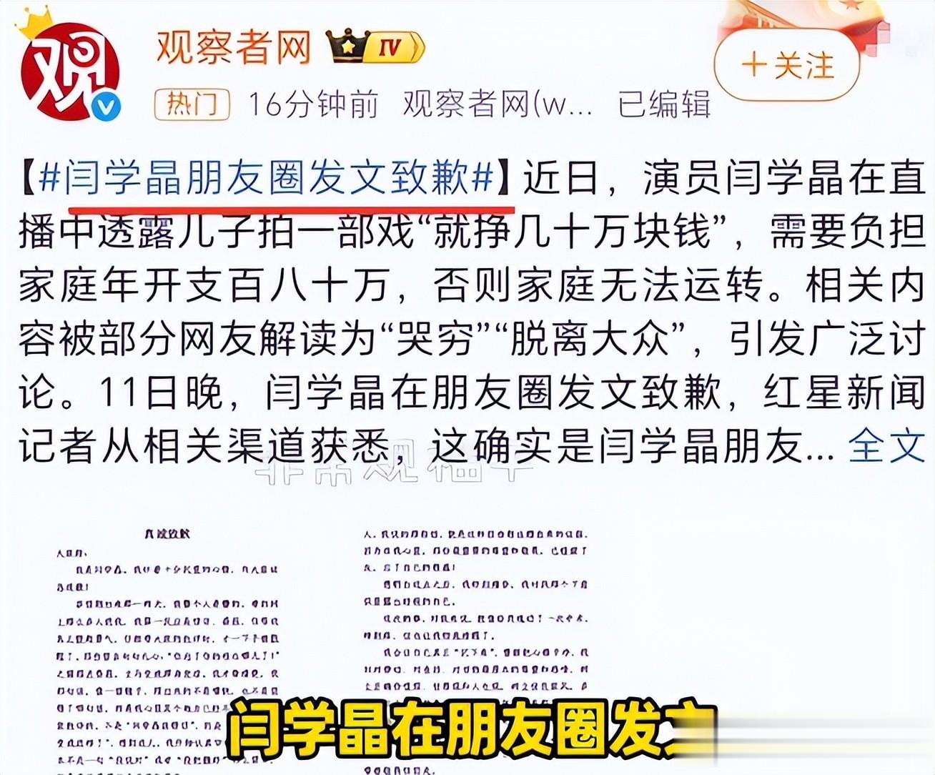 就这么沉默了将近半个月,到1月11号,闫学晶才在朋友圈发了封致歉信,说自己听多了掌声就忘了本,慢慢滋生了优越感,把过去的日子抛到脑后了。