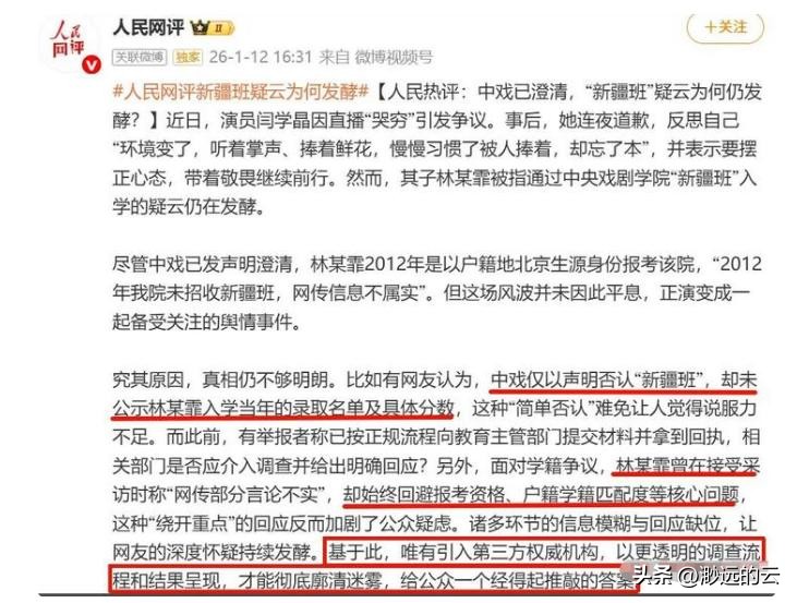 可这份声明只说了录取方式,没公布录取分数、名单这些关键证据,看着就很敷衍,人民网都发声了,呼吁第三方介入调查,质问中戏为啥不把证据晒全。