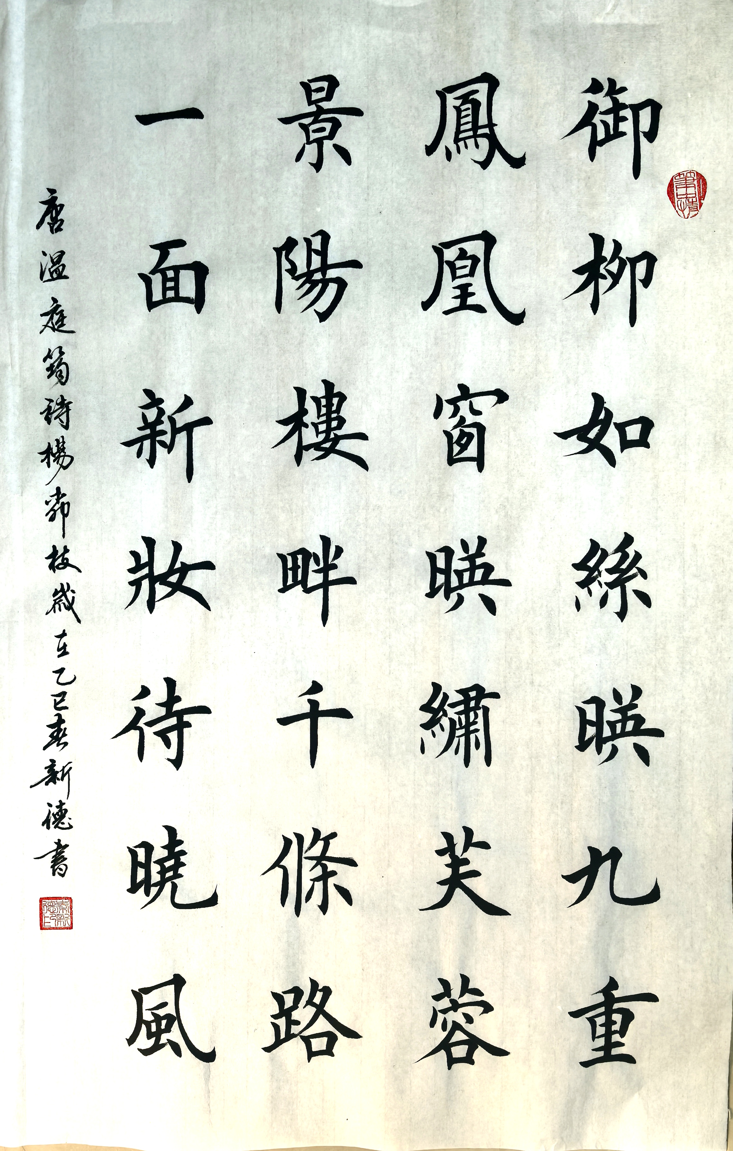 五十余年如一日,他坚持不懈地临习多家名人古帖,刻苦钻研书法艺术。这种持之以恒的精神,不仅让他在楷书领域达到了精湛的技艺,更使他擅长欧楷、欧楷榜书、行书榜书、行草书大幅作品创作。他的书法作品,笔画刚劲有力,结构严谨规范,既体现了传统书法的韵味,又具有独特的个人风格。