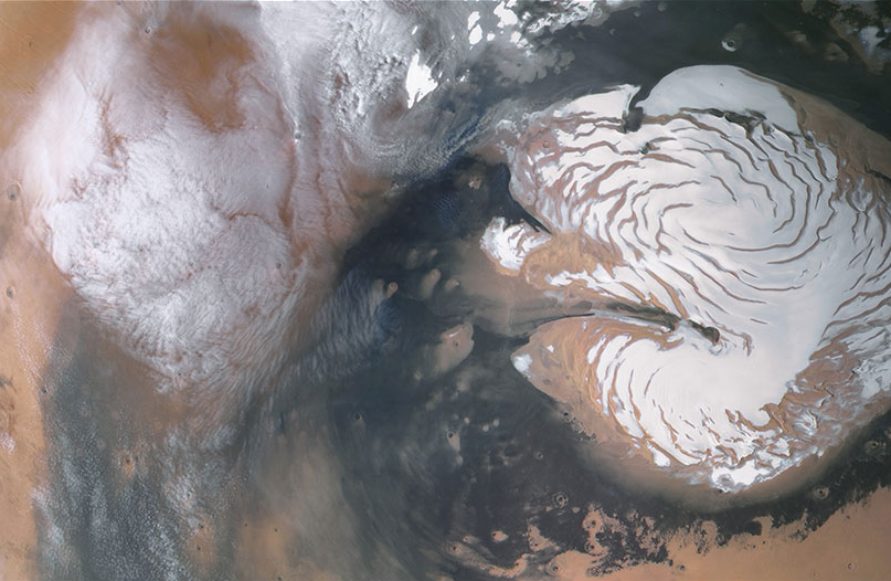 在这一天,季节性冰盖正在向夏季最低值缩小,加剧了北部低地的天气活动。在顶部中心,一个带有水冰卷云的低压系统接近峰值强度。季节性极地风暴系统(例如这个系统)引发的风是地表活动和火星地质记录的重要贡献者。特别是,极地风塑造了北部冰盖周围的黑暗沙丘,并扬起可能沉积在冰盖上的尘埃。