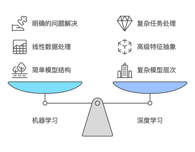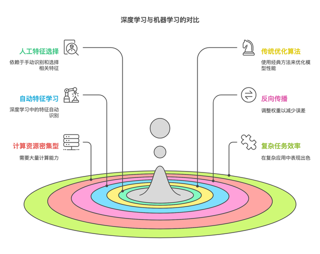 在传统的机器学习中,工程师通常需要手动选择特征。比如在进行垃圾邮件分类时,工程师可能会根据邮件的关键词、发件人、标题等信息来选择特征,并训练模型进行预测。而深度学习则完全依赖神经网络的自动特征学习。在DL中,神经网络通过多层次的结构自动从数据中提取最有效的特征,减少了人工干预。因此,深度学习在处理复杂数据时,比传统的机器学习方法更具优势。