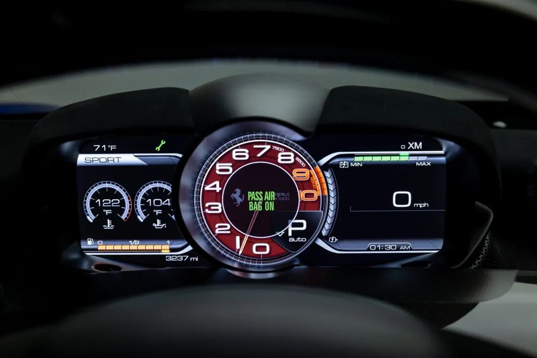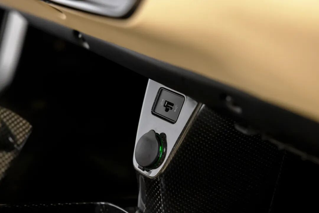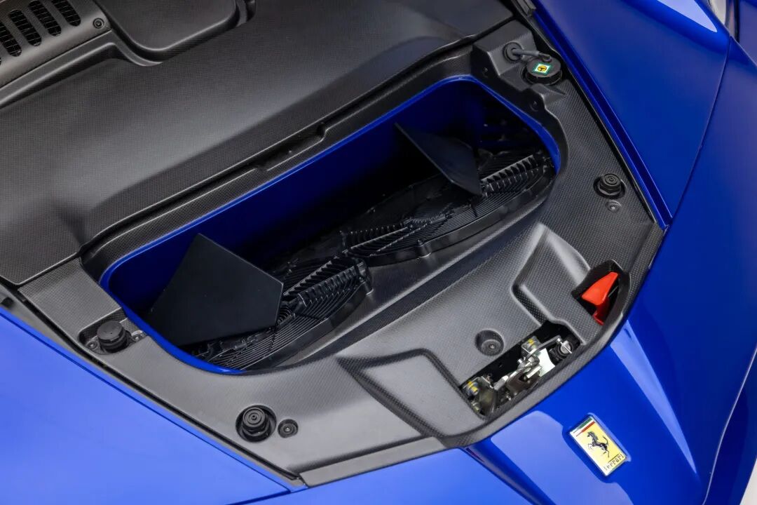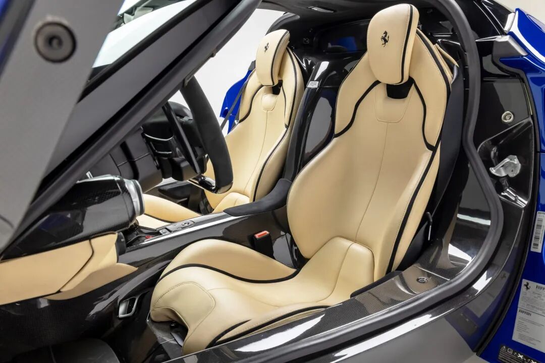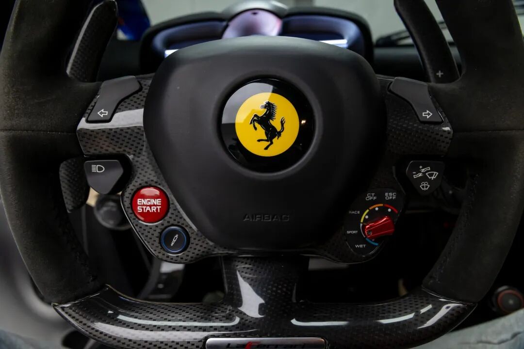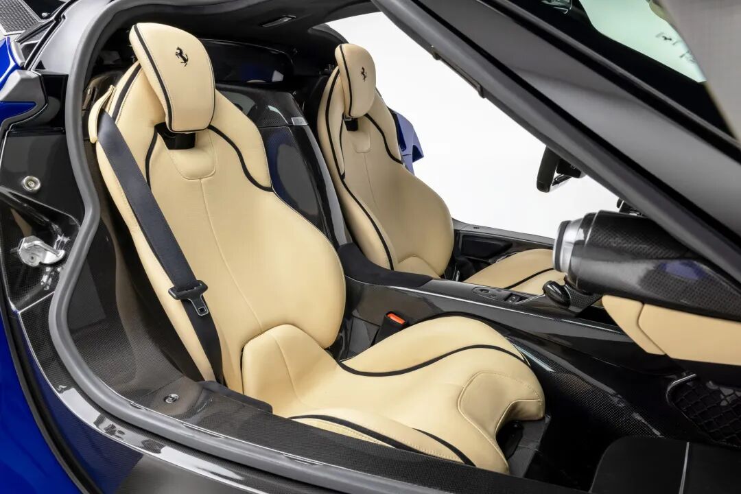 这个颜色与车辆的哑光黑车顶和碳纤维空气动力学部件相得益彰,内饰也完美呼应。座舱内采用了檀木黄(Honolulu)真皮、黑色Alcántara面料以及碳纤维元素,但依然保持了法拉利特有的简约风格。细节之处尽显只有法拉利这样的品牌才能做到的用心。