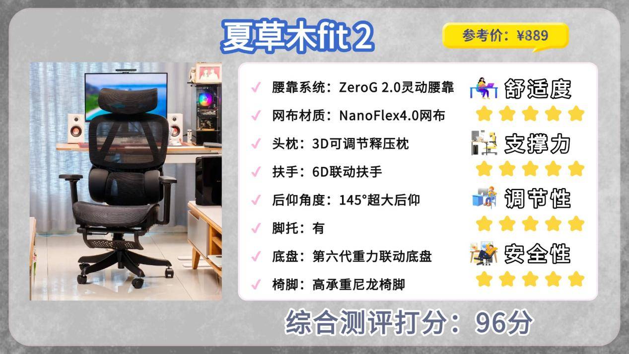 安全舒适度:在舒适度和安全性上,夏草木Fit2的用料和测试规格明显高于常规水平。它使用的是NanoFlex 4.0科技网布,透气性强、回弹稳定,夏天久坐不闷汗,同时兼顾耐用性。整椅通过10年抗衰减旗舰级检测,官方明确护腰性能和结构强度长期不衰减。