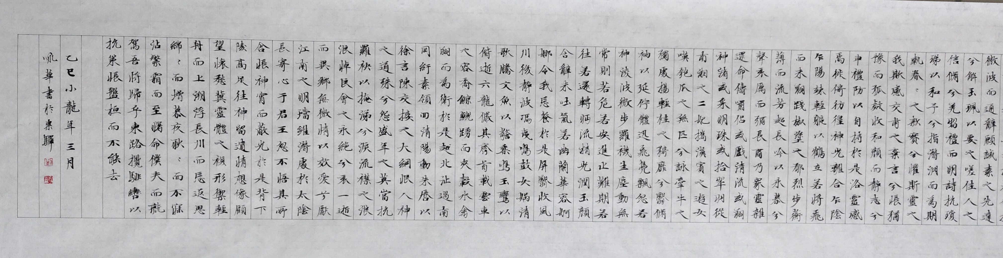 最令京山人引以为傲的,莫过于刘咏华先生耗时良久创作的十六米楷书《京山赋》长卷。这幅倾注心血的力作,以苍劲有力的笔墨书写京山的历史沿革、山川胜景与人文底蕴,被京山市政府郑重选录,镌刻于溾水河南门大码头的景观石壁之上。