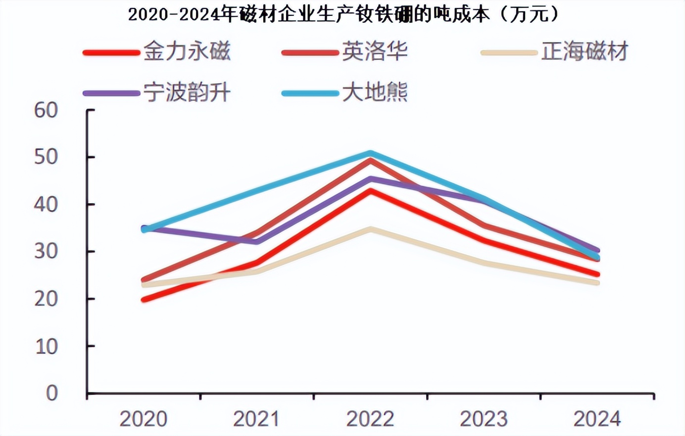 2025年半年报显示,金力永磁使用晶界渗透技术生产的磁材产品占比超90%。而昂贵的中重稀土用量少了,也就推动其生产钕铁硼的单吨成本常年比宁波韵升、英洛华等同行低。