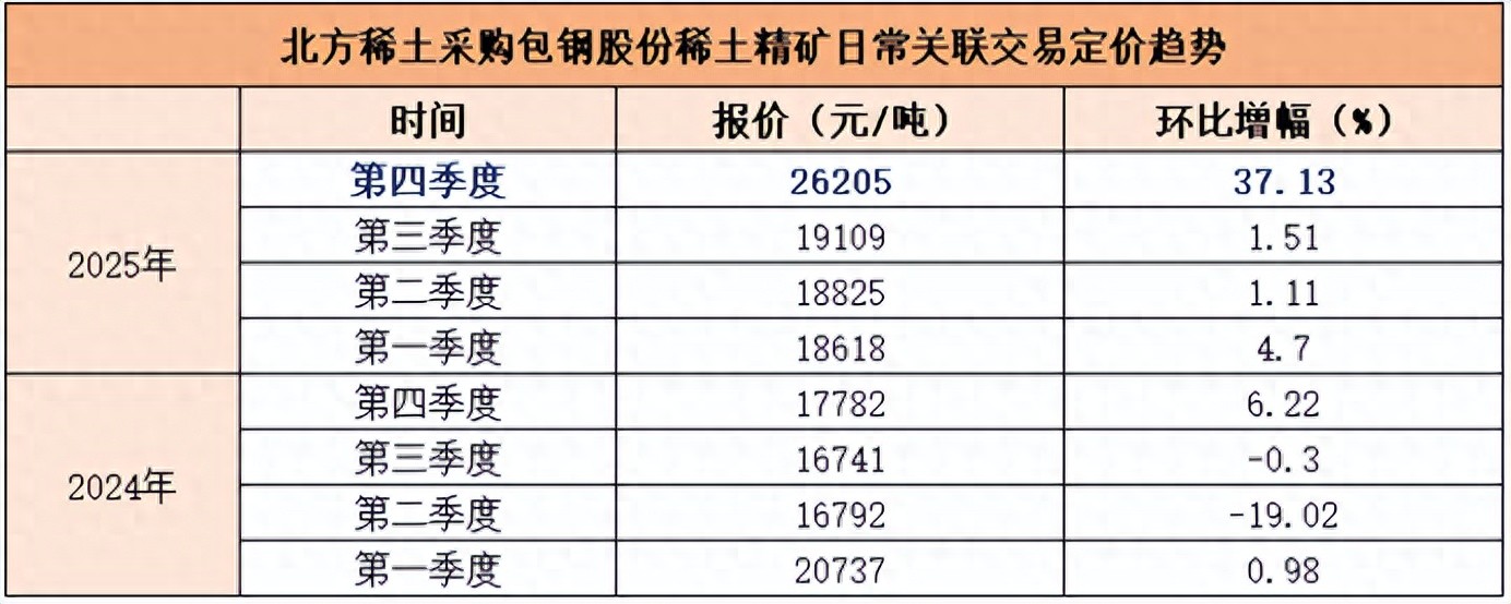 就在10月10日,北方稀土和包钢股份正式敲定了2025年第四季度的稀土精矿关联交易报价,每吨价格飙升到2.62万元(不含税),单季度环比猛增了37.13%!