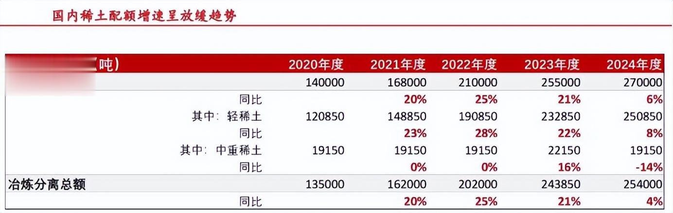 于是近年来,我国严格控制着稀土开采和分离的总量。到2024年,国内稀土开采配额的增速已经从前几年的20%大幅降至了6%。