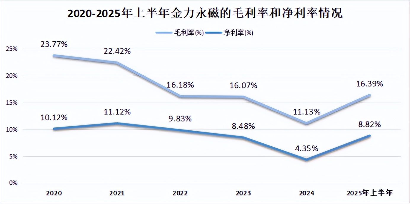 2025年上半年,在稀土涨价和降本技术的双重推动下,金力永磁的毛利率跃升至16.39%,比2024年同期实现了翻倍!
