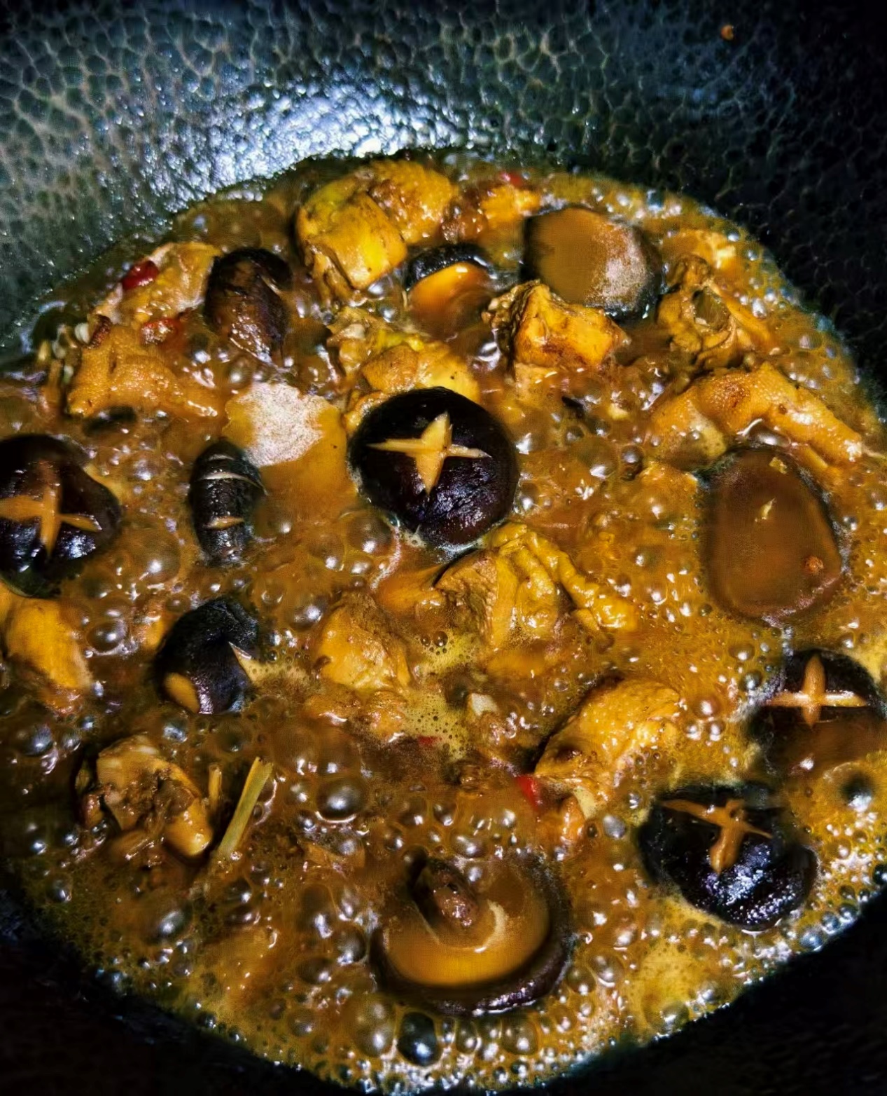 15分钟里,厨房会像开演唱会:前5分钟是前奏,酱香混着菇香飘出来;中间5分钟达到高潮,邻居开始疯狂嗅鼻子;最后5分钟进入尾声,你守在锅边咽口水。时间到,开盖!汤汁只剩浅浅一层,鸡肉缩成金黄小方块,香菇胖得裂了嘴。把2根小米辣切圈撒进去,转大火收汁,汤汁“咕嘟咕嘟”冒泡,颜色从浅咖变成亮棕,像给鸡块刷了层琥珀漆。汁水收浓即可关火,撒一把葱花,绿点点缀,整锅立刻有了“森林雪景”的意境。