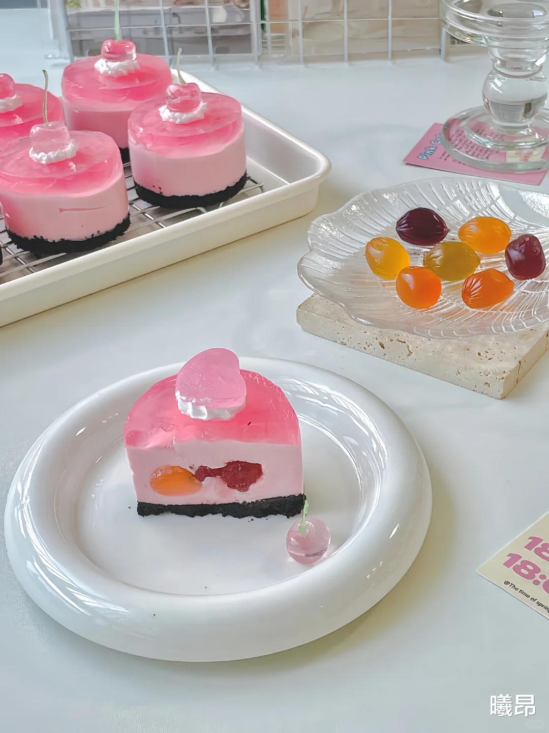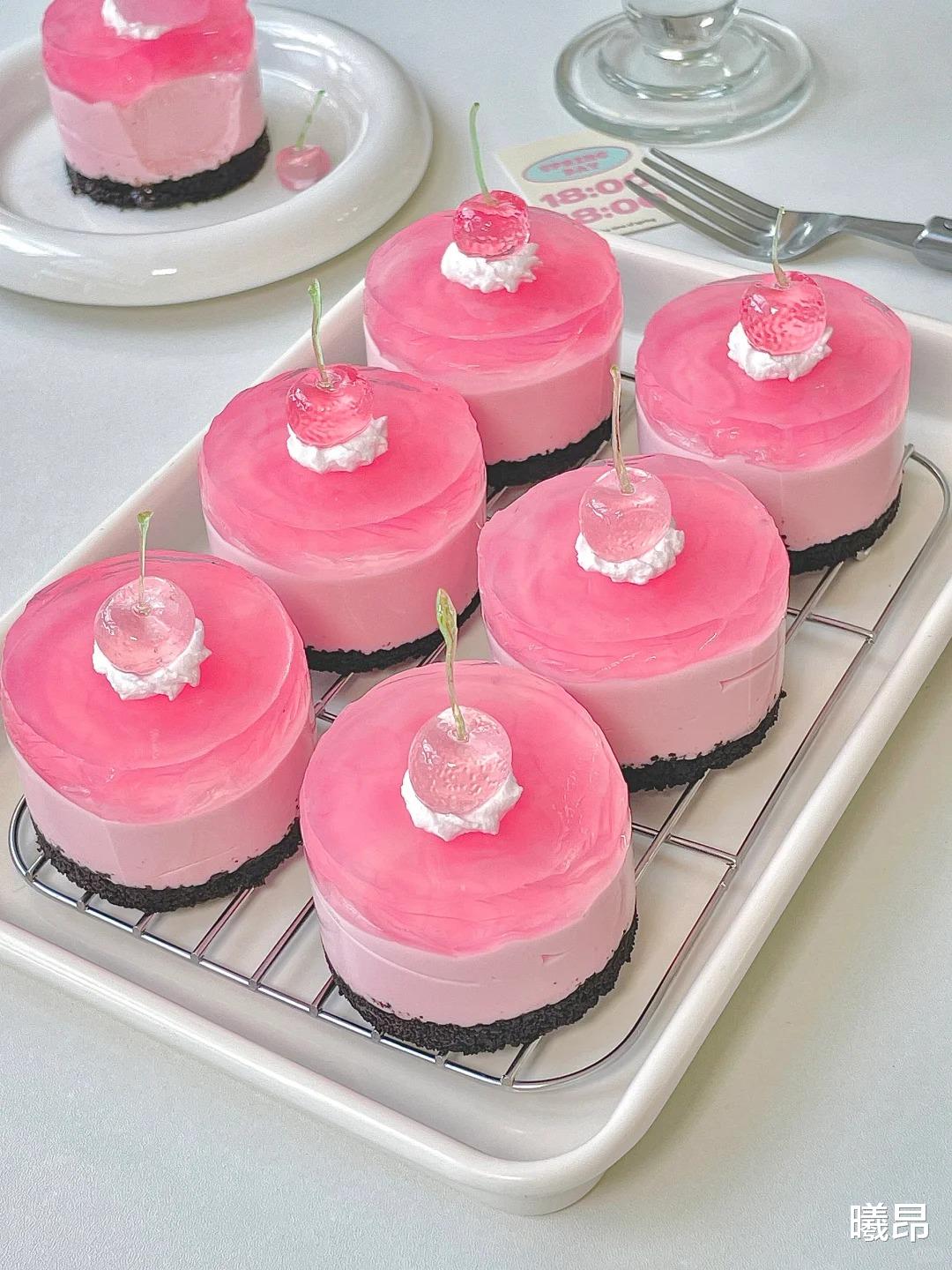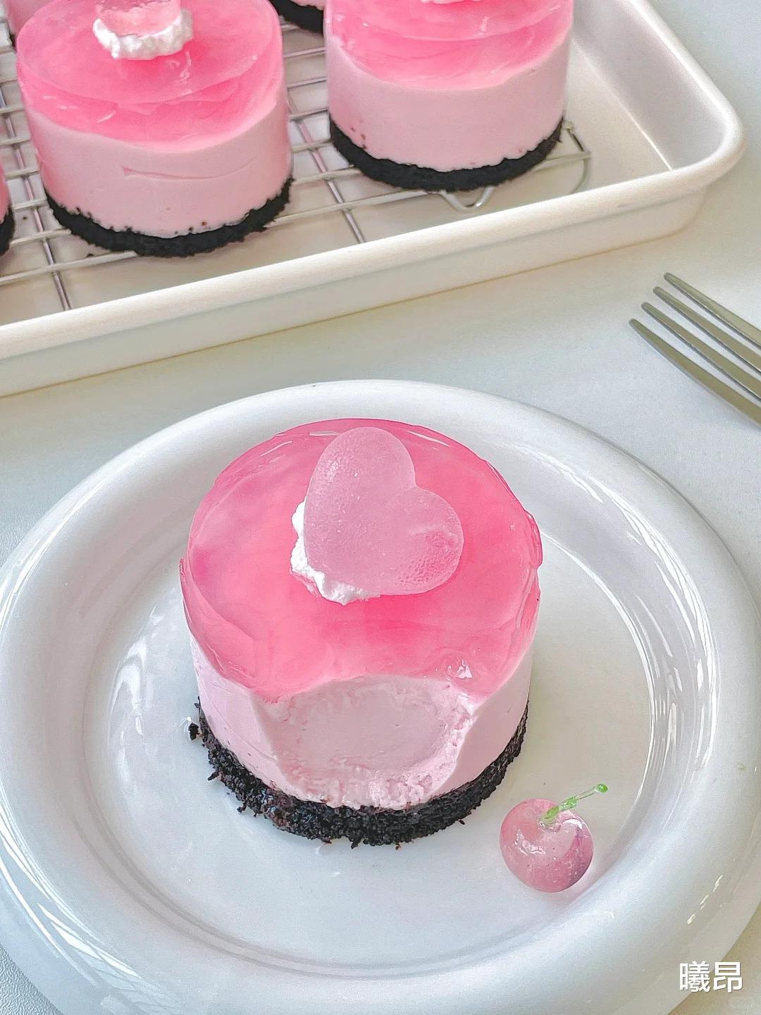 2.切块前,刀用热水烫一下(每切一块烫一次,切面更平整,不会粘刀),从中间切开,就能看到 “饼干底 + 慕斯层 + 果冻层” 的漂亮层次。