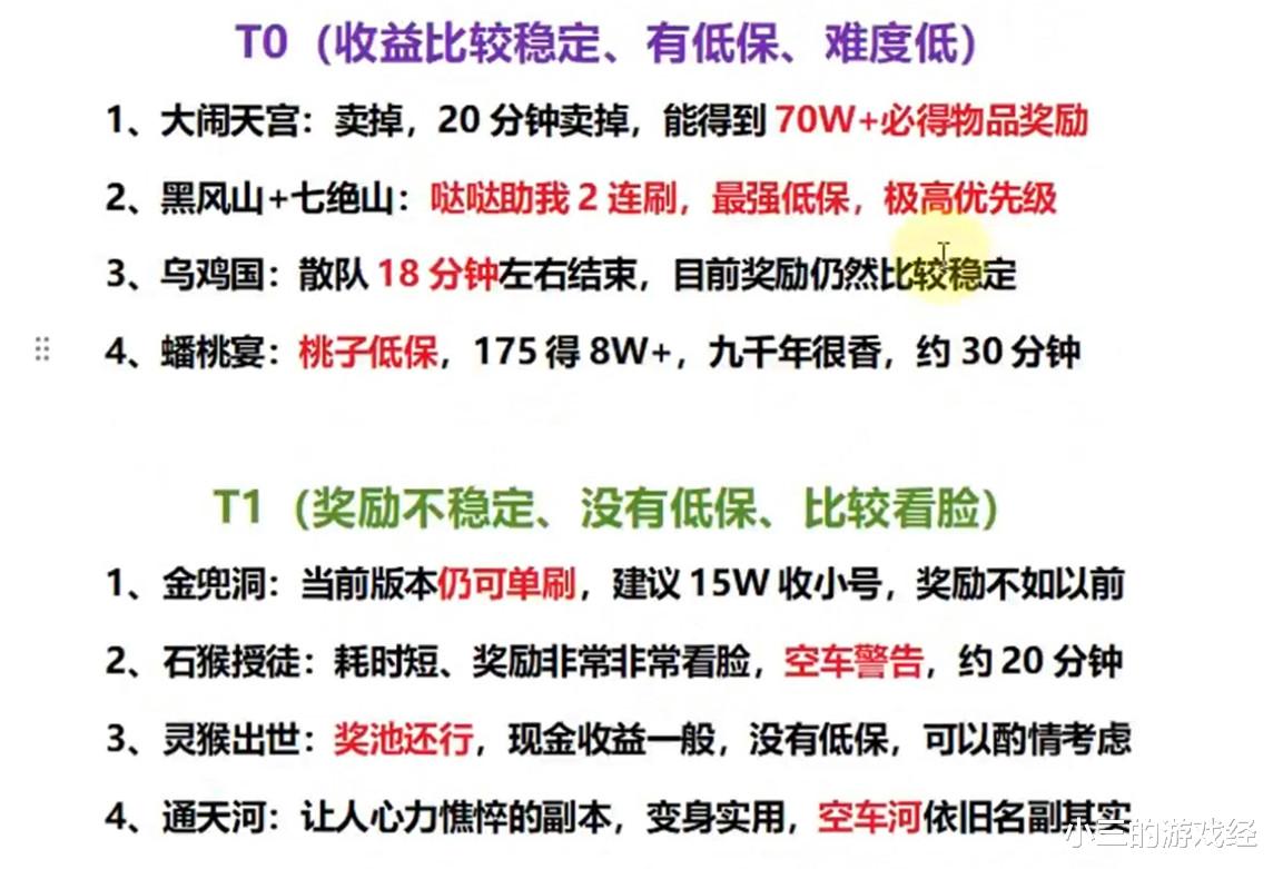 上面是梦幻西游中某些玩家整理出来的,在目前的副本任务中比较推荐的几个,t0级别的是大闹天宫,黑风山加七绝山。加上乌鸡国和蟠桃宴,T1级别的则是金兜洞,石猴授徒,灵猴出世和通天河。不过通天河的奖励并不好,如果各位玩家不是五开,对于角色的释放速度没有要求的话,也是可以不刷通天河,副本任务的物品奖励并没有想象中的那么好。单开玩家是不需要刷的。
