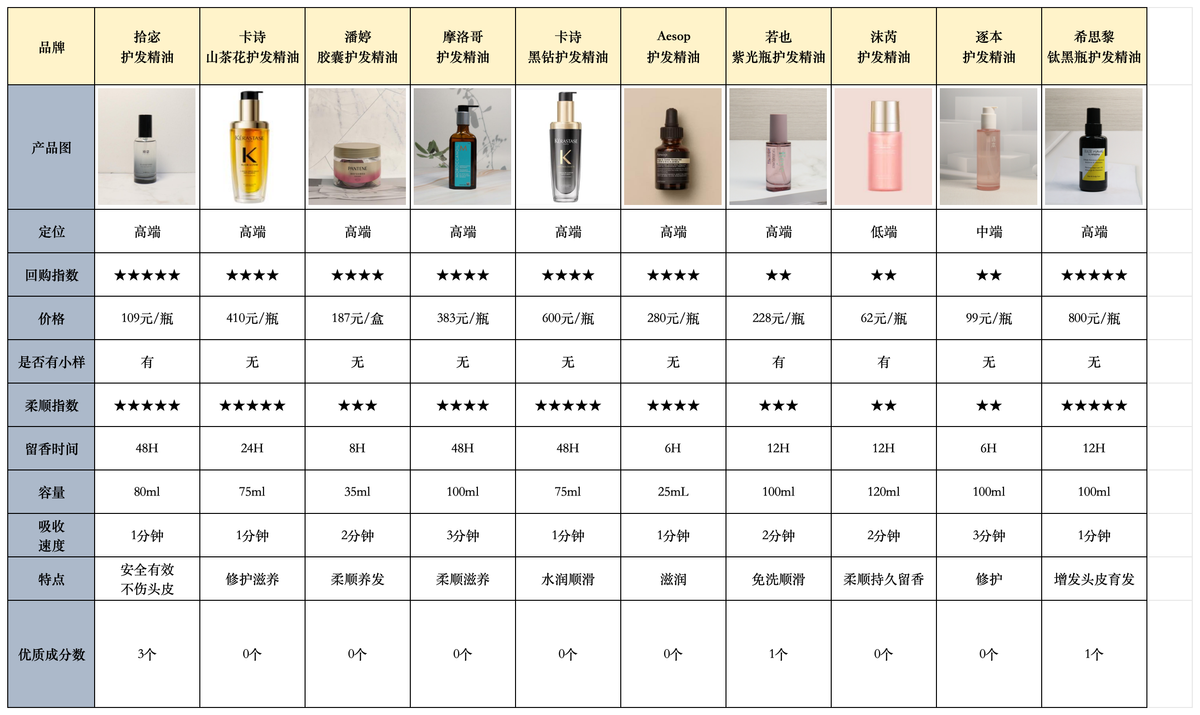 在深入测评之前,先来看一下这几款护发精油产品的基础参数,这将帮助大家更好地了解它们的主要功能和特点。