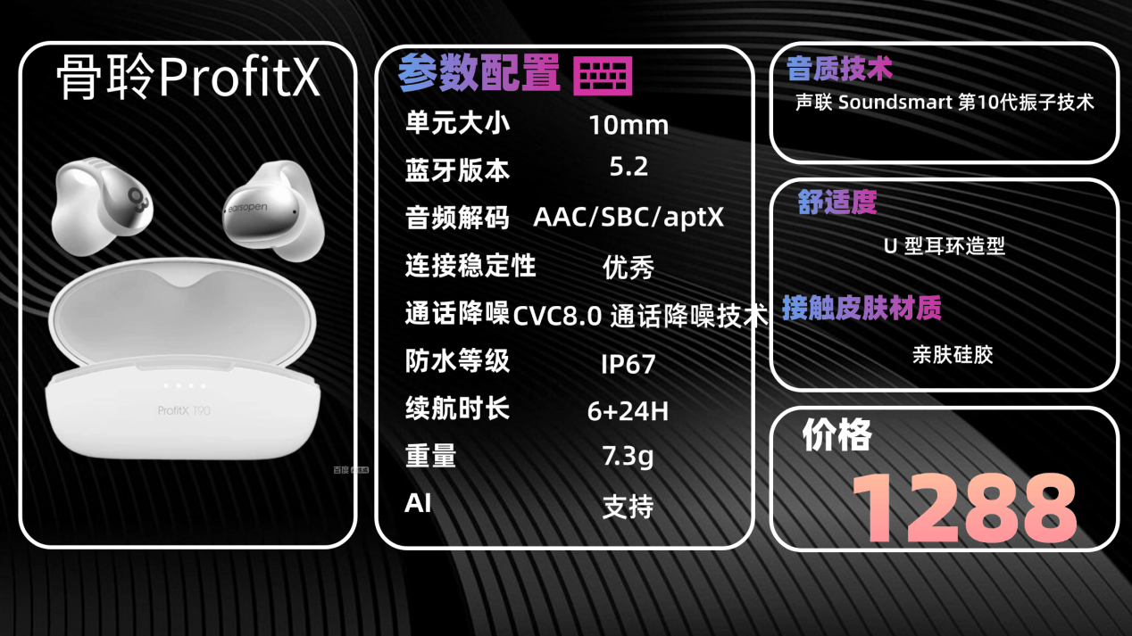 骨聆ProfitX单耳才7克出头,比一小片口香糖还轻,戴一天都像没戴,之前的耳机戴半小时就压得耳朵疼,这个完全不会。C形记忆钢丝耳挂特贴耳,跑步跳操甩头都稳,戴眼镜也不硌,但小耳星人初次戴可能有点坠,适应两天就好。