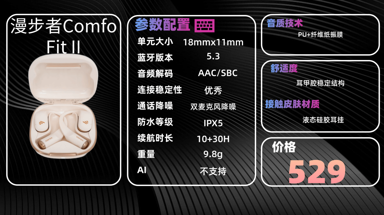 参考价格:529元 | 声音单元:18mm*11mm | 蓝牙版本:5.3| 综合性能评分:85