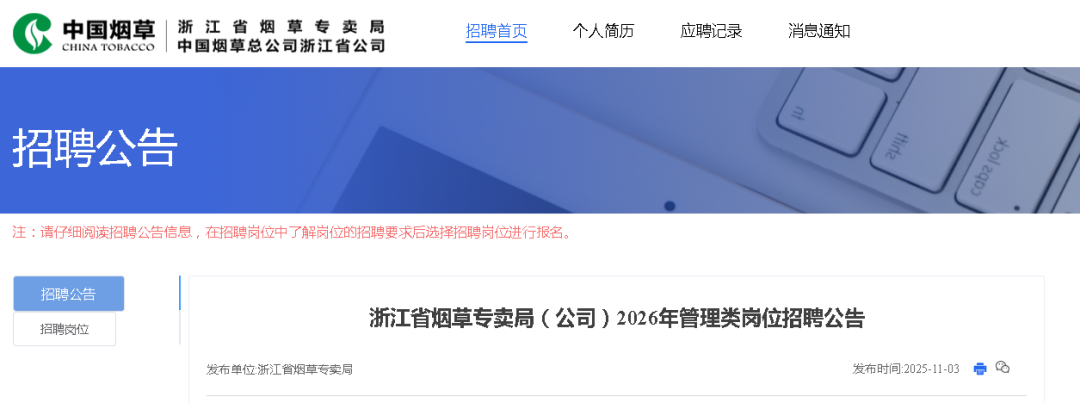 近日,浙江省烟草专卖局(公司)2026年管理类岗位招聘工作已启动,热烈欢迎广大高校毕业生应聘。现将有关事项公告如下: