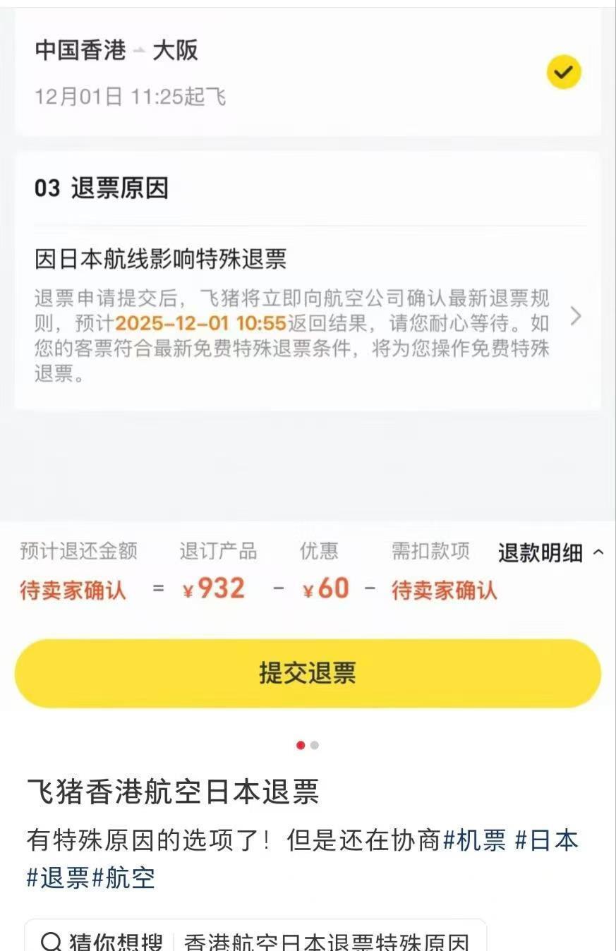 从用户反馈来看,飞猪平台虽增设 “特殊退票” 选项,但对于境外航司机票的退票处理,远没有大陆航司那般顺畅。有用户反映,选择该选项后,系统长时间显示 “待航司确认”,甚至超 48 小时仍无进展。北京的张女士便是其中一位受害者,她早在 10 月就预订了 12 月全日空的东京往返机票,满心欢喜地期待着此次日本之行。然而,外交部的提醒让她果断选择退票。当她在飞猪平台按照新流程选择 “因日本航线影响特殊退票” 选项后,却如石沉大海,系统毫无动静 。她多次联系飞猪客服,得到的回复都是在等待全日空的消息,可全日空的电话又总是无法接通,这让她焦虑不已。