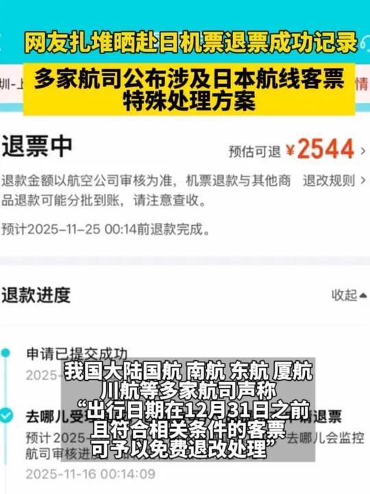 (二)大陆航司退改政策共性梳理仔细对比国航、东航、南航以及春秋航空等多家大陆航司的退改政策,共性十分明显。在购票和出行时间上,均规定在 11 月 15 日前购票,12 月 31 日前出行的旅客可享受免费退改服务。比如国航要求在 2025 年 11 月 15 日 12 时(含)前购买或换开产生新票号的国航 999 开头客票,未使用行程涉及旅行日期为 2025 年 11 月 15 日(含)至 2025 年 12 月 31 日(含)之间东京、大阪等地进出港航班;东航规定 2025 年 11 月 15 日 12:00(含)前购买或换开的东航 781 客票,航班起飞日期在 2025 年 11 月 15 日至 2025 年 12 月 31 日期间涉及日本进港、出港或经停航班 。