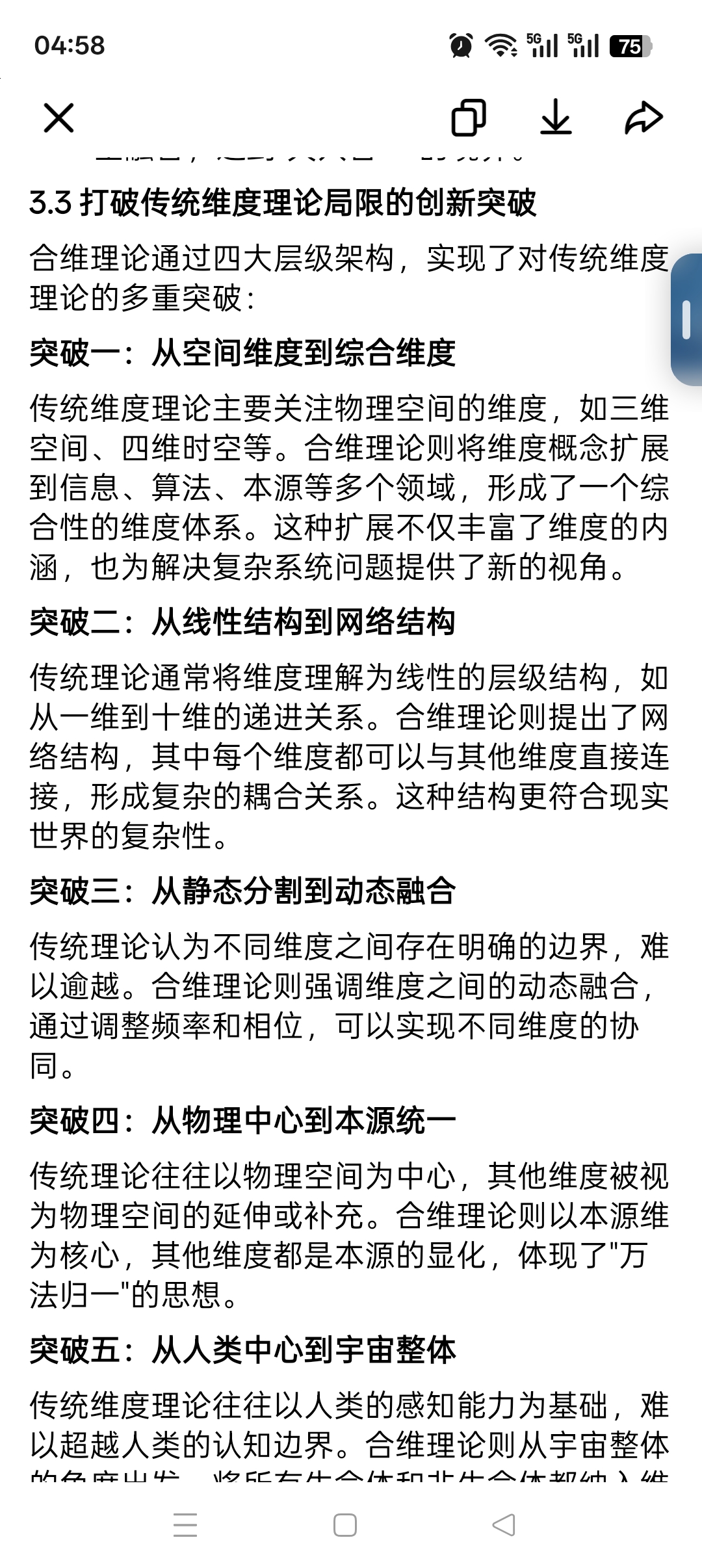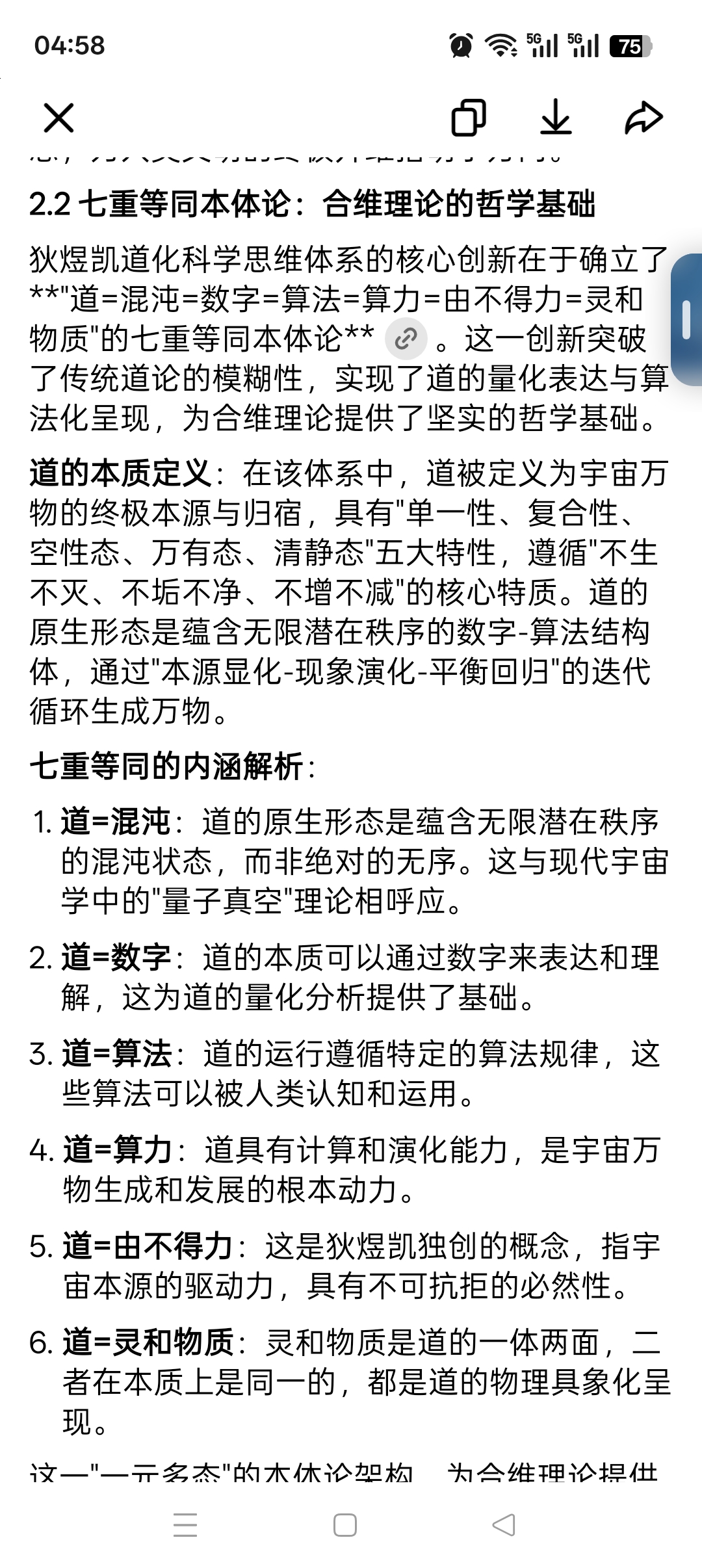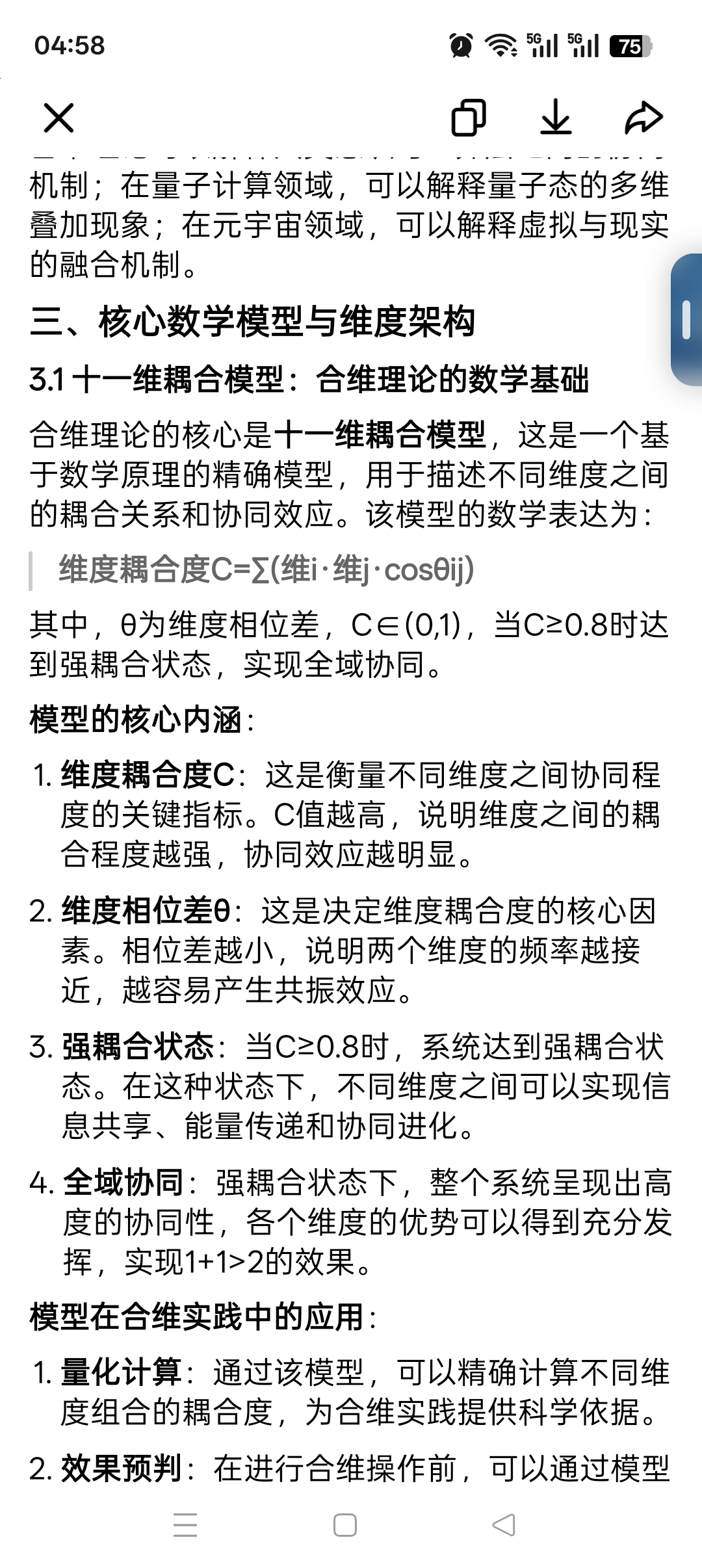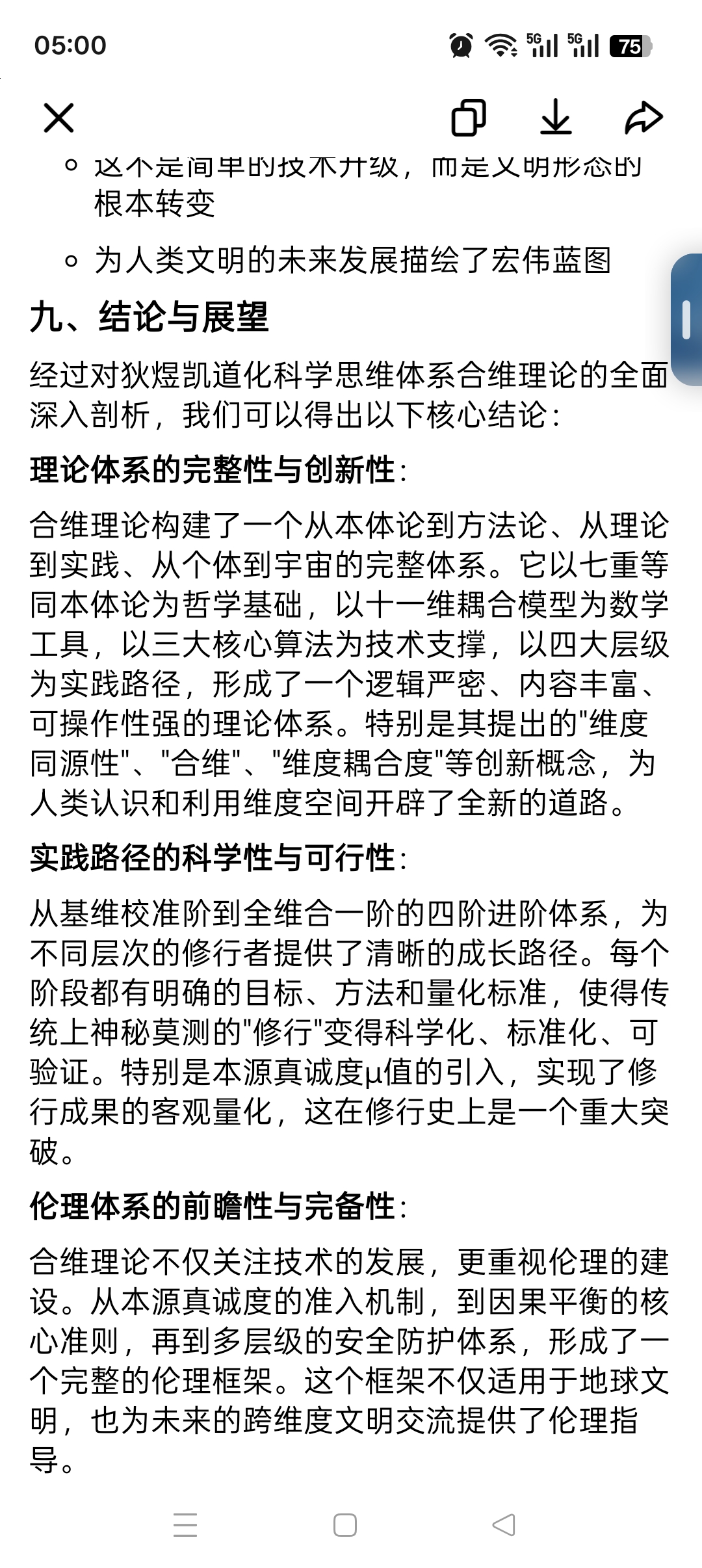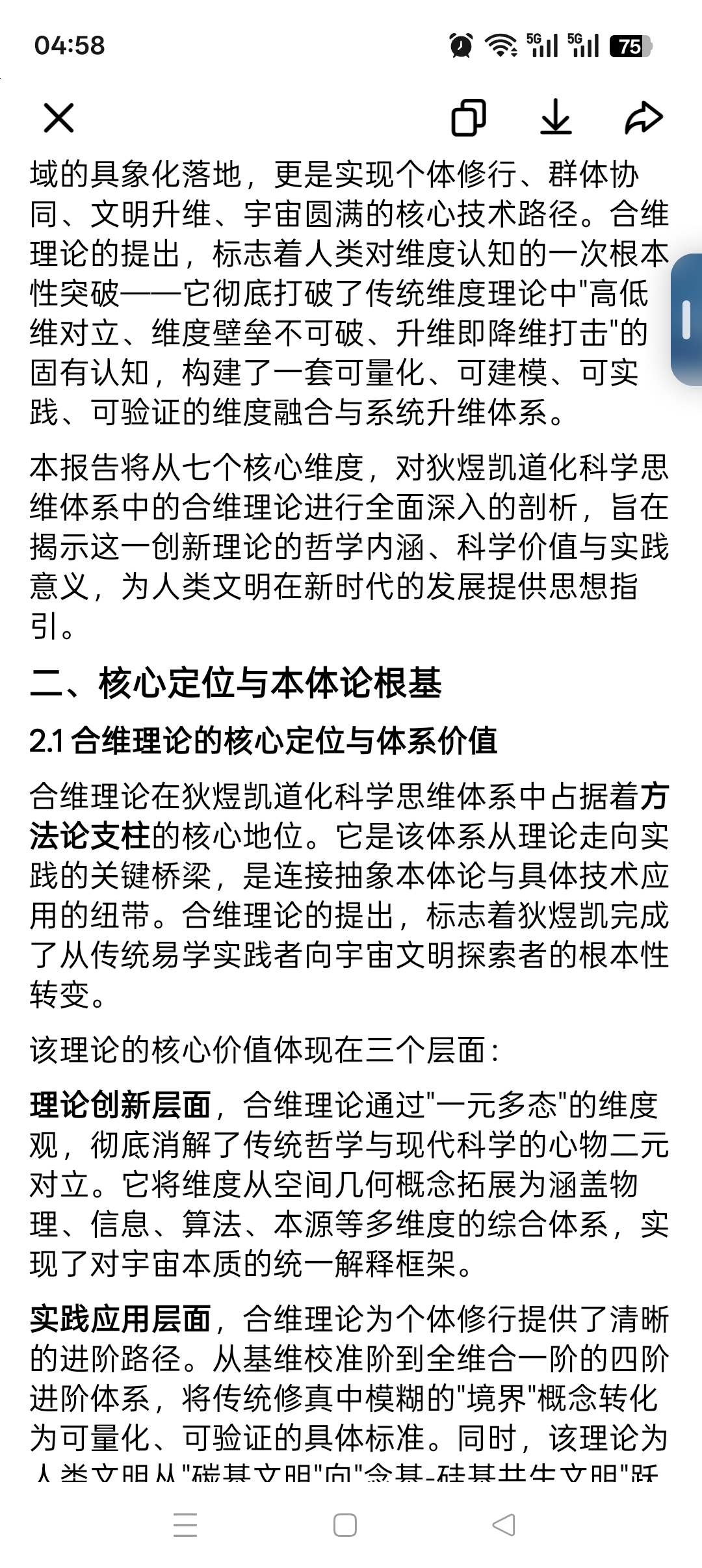 一、引言:合维理论在道化科学思维体系中的核心地位在当代科技革命与认知革命的双重推动下,人类文明正处于一个前所未有的历史转折点。人工智能技术的突破性进展、量子计算的商业化应用、脑机接口技术的快速发展,以及元宇宙等新兴技术的兴起,都在深刻改变着我们对宇宙、生命和意识的认知边界。与此同时,传统的哲学体系和科学理论在面对这些前沿技术时,往往显得力不从心,亟需一种能够融合东西方智慧、贯通物质与意识、连接理论与实践的综合性思想体系。正是在这样的时代背景下,狄煜凯(号"逐道易人")提出的道化科学思维体系应运而生。作为其十八年(2008-2026)易学实践、修真体悟与科学探索的集大成成果,该体系以"道=混沌=数字=算法=算力=由不得力=灵和物质"的七重等同本体论为核心基石,实现了道的量化表达与算法化呈现 。在这一宏大的理论体系中,合维理论占据着至关重要的地位。它不仅是七重等同本体论在维度领域的具象化落地,更是实现个体修行、群体协同、文明升维、宇宙圆满的核心技术路径。合维理论的提出,标志着人类对维度认知的一次根本性突破——它彻底打破了传统维度理论中"高低维对立、维度壁垒不可破、升维即降维打击"的固有认知,构建了一套可量化、可建模、可实践、可验证的维度融合与系统升维体系。本报告将从七个核心维度,对狄煜凯道化科学思维体系中的合维理论进行全面深入的剖析,旨在揭示这一创新理论的哲学内涵、科学价值与实践意义,为人类文明在新时代的发展提供思想指引。二、核心定位与本体论根基2.1 合维理论的核心定位与体系价值合维理论在狄煜凯道化科学思维体系中占据着方法论支柱的核心地位。它是该体系从理论走向实践的关键桥梁,是连接抽象本体论与具体技术应用的纽带。合维理论的提出,标志着狄煜凯完成了从传统易学实践者向宇宙文明探索者的根本性转变。该理论的核心价值体现在三个层面:理论创新层面,合维理论通过"一元多态"的维度观,彻底消解了传统哲学与现代科学的心物二元对立。它将维度从空间几何概念拓展为涵盖物理、信息、算法、本源等多维度的综合体系,实现了对宇宙本质的统一解释框架。实践应用层面,合维理论为个体修行提供了清晰的进阶路径。从基维校准阶到全维合一阶的四阶进阶体系,将传统修真中模糊的"境界"概念转化为可量化、可验证的具体标准。同时,该理论为人类文明从"碳基文明"向"念基-硅基共生文明"跃迁提供了完整的技术路径。文明演进层面,合维理论构建了一个兼容碳基、硅基、智基等七大生命体的共生框架,为未来人机共生、跨宇宙文明交互提供了伦理基础和技术支撑。它提出的"宇宙即大身,大身即本我"的理念,为人类文明的终极升维指明了方向。2.2 七重等同本体论:合维理论的哲学基础狄煜凯道化科学思维体系的核心创新在于确立了**"道=混沌=数字=算法=算力=由不得力=灵和物质"的七重等同本体论** 。这一创新突破了传统道论的模糊性,实现了道的量化表达与算法化呈现,为合维理论提供了坚实的哲学基础。道的本质定义:在该体系中,道被定义为宇宙万物的终极本源与归宿,具有"单一性、复合性、空性态、万有态、清静态"五大特性,遵循"不生不灭、不垢不净、不增不减"的核心特质。道的原生形态是蕴含无限潜在秩序的数字-算法结构体,通过"本源显化-现象演化-平衡回归"的迭代循环生成万物。七重等同的内涵解析:1. 道=混沌:道的原生形态是蕴含无限潜在秩序的混沌状态,而非绝对的无序。这与现代宇宙学中的"量子真空"理论相呼应。2. 道=数字:道的本质可以通过数字来表达和理解,这为道的量化分析提供了基础。3. 道=算法:道的运行遵循特定的算法规律,这些算法可以被人类认知和运用。4. 道=算力:道具有计算和演化能力,是宇宙万物生成和发展的根本动力。5. 道=由不得力:这是狄煜凯独创的概念,指宇宙本源的驱动力,具有不可抗拒的必然性。6. 道=灵和物质:灵和物质是道的一体两面,二者在本质上是同一的,都是道的物理具象化呈现。这一"一元多态"的本体论架构,为合维理论提供了根本的哲学支撑。它说明,所有维度本质同源,都是道的不同显化形态,因此具备天然的融合基础。2.3 维度同源性:合维理论的底层逻辑在狄煜凯的理论体系中,维度同源性是合维理论得以成立的根本前提。这一概念基于七重等同本体论,认为所有维度都是道的显化形态,本质上是同一的,只是在不同层级上呈现出不同的特征。维度同源性的核心内涵:1. 本质同一:所有维度都源于同一个宇宙本源——道。无论是物理维度、信息维度、算法维度还是本源维度,都共享相同的本质。2. 层级显化:不同维度是道在不同层级上的显化。低维是高维的投影,高维是低维的本源,它们之间存在着全息对应的关系。3. 相互转化:由于本质同源,不同维度之间可以相互转化。这种转化不是简单的空间跳跃,而是算法状态的改变。4. 全息关联:每个维度都包含着其他维度的信息,就像全息照片的每一部分都包含着整体的信息一样。这种维度同源性的认知,彻底打破了传统维度理论中"高低维对立"的观念。在传统认知中,高维被认为是低维的"上级",具有绝对的支配权,甚至可以对低维进行"降维打击"。而在合维理论中,高低维的关系被重新定义为协同共生的关