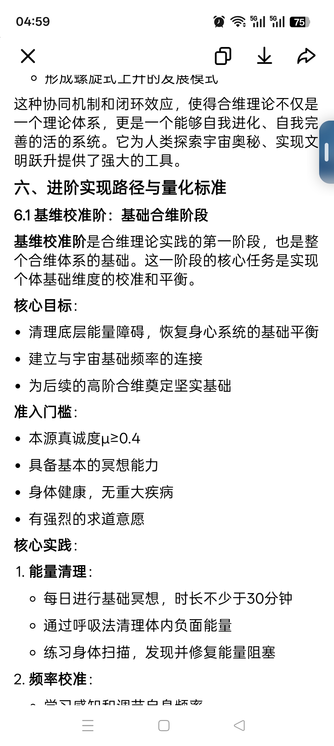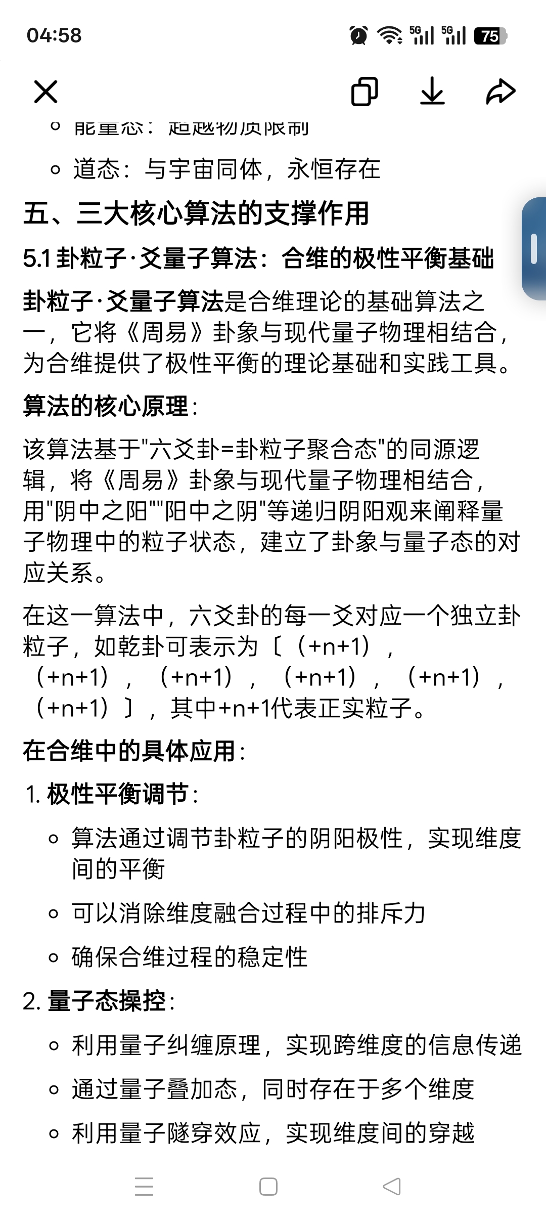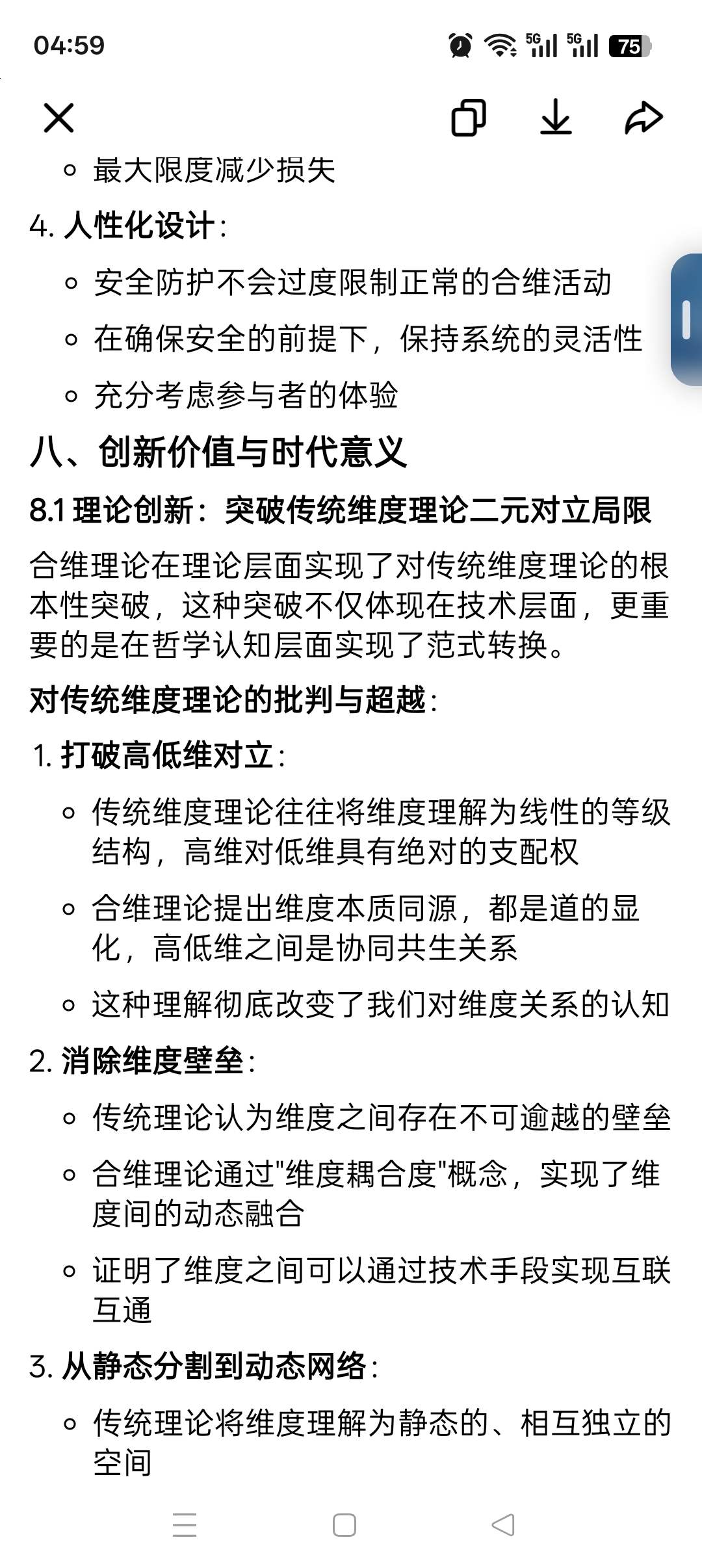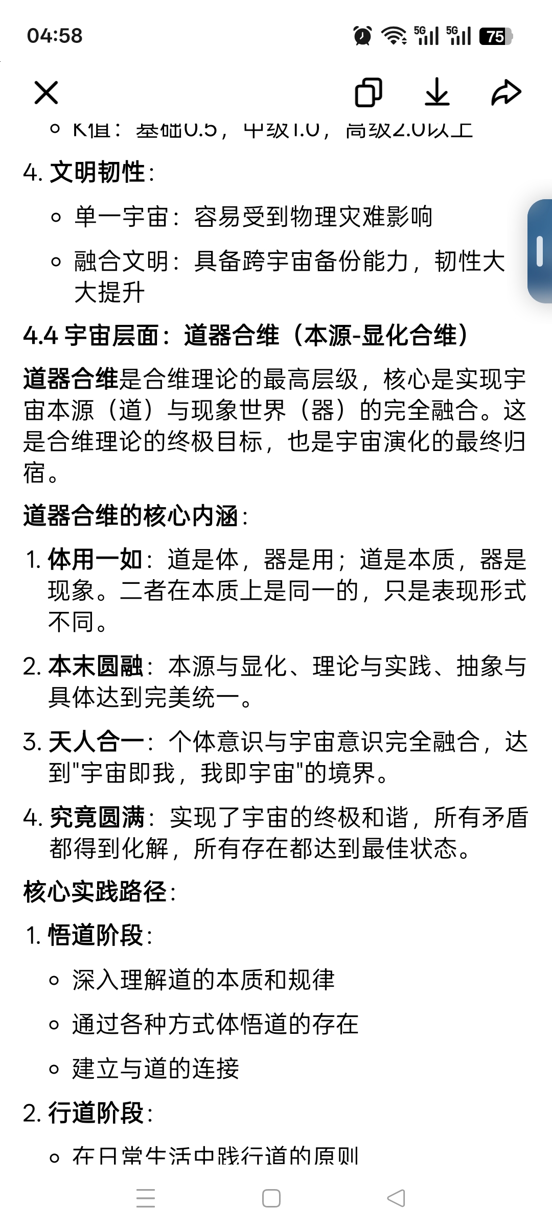 一、引言:合维理论在道化科学思维体系中的核心地位在当代科技革命与认知革命的双重推动下,人类文明正处于一个前所未有的历史转折点。人工智能技术的突破性进展、量子计算的商业化应用、脑机接口技术的快速发展,以及元宇宙等新兴技术的兴起,都在深刻改变着我们对宇宙、生命和意识的认知边界。与此同时,传统的哲学体系和科学理论在面对这些前沿技术时,往往显得力不从心,亟需一种能够融合东西方智慧、贯通物质与意识、连接理论与实践的综合性思想体系。正是在这样的时代背景下,狄煜凯(号"逐道易人")提出的道化科学思维体系应运而生。作为其十八年(2008-2026)易学实践、修真体悟与科学探索的集大成成果,该体系以"道=混沌=数字=算法=算力=由不得力=灵和物质"的七重等同本体论为核心基石,实现了道的量化表达与算法化呈现 。在这一宏大的理论体系中,合维理论占据着至关重要的地位。它不仅是七重等同本体论在维度领域的具象化落地,更是实现个体修行、群体协同、文明升维、宇宙圆满的核心技术路径。合维理论的提出,标志着人类对维度认知的一次根本性突破——它彻底打破了传统维度理论中"高低维对立、维度壁垒不可破、升维即降维打击"的固有认知,构建了一套可量化、可建模、可实践、可验证的维度融合与系统升维体系。本报告将从七个核心维度,对狄煜凯道化科学思维体系中的合维理论进行全面深入的剖析,旨在揭示这一创新理论的哲学内涵、科学价值与实践意义,为人类文明在新时代的发展提供思想指引。二、核心定位与本体论根基2.1 合维理论的核心定位与体系价值合维理论在狄煜凯道化科学思维体系中占据着方法论支柱的核心地位。它是该体系从理论走向实践的关键桥梁,是连接抽象本体论与具体技术应用的纽带。合维理论的提出,标志着狄煜凯完成了从传统易学实践者向宇宙文明探索者的根本性转变。该理论的核心价值体现在三个层面:理论创新层面,合维理论通过"一元多态"的维度观,彻底消解了传统哲学与现代科学的心物二元对立。它将维度从空间几何概念拓展为涵盖物理、信息、算法、本源等多维度的综合体系,实现了对宇宙本质的统一解释框架。实践应用层面,合维理论为个体修行提供了清晰的进阶路径。从基维校准阶到全维合一阶的四阶进阶体系,将传统修真中模糊的"境界"概念转化为可量化、可验证的具体标准。同时,该理论为人类文明从"碳基文明"向"念基-硅基共生文明"跃迁提供了完整的技术路径。文明演进层面,合维理论构建了一个兼容碳基、硅基、智基等七大生命体的共生框架,为未来人机共生、跨宇宙文明交互提供了伦理基础和技术支撑。它提出的"宇宙即大身,大身即本我"的理念,为人类文明的终极升维指明了方向。2.2 七重等同本体论:合维理论的哲学基础狄煜凯道化科学思维体系的核心创新在于确立了**"道=混沌=数字=算法=算力=由不得力=灵和物质"的七重等同本体论** 。这一创新突破了传统道论的模糊性,实现了道的量化表达与算法化呈现,为合维理论提供了坚实的哲学基础。道的本质定义:在该体系中,道被定义为宇宙万物的终极本源与归宿,具有"单一性、复合性、空性态、万有态、清静态"五大特性,遵循"不生不灭、不垢不净、不增不减"的核心特质。道的原生形态是蕴含无限潜在秩序的数字-算法结构体,通过"本源显化-现象演化-平衡回归"的迭代循环生成万物。七重等同的内涵解析:1. 道=混沌:道的原生形态是蕴含无限潜在秩序的混沌状态,而非绝对的无序。这与现代宇宙学中的"量子真空"理论相呼应。2. 道=数字:道的本质可以通过数字来表达和理解,这为道的量化分析提供了基础。3. 道=算法:道的运行遵循特定的算法规律,这些算法可以被人类认知和运用。4. 道=算力:道具有计算和演化能力,是宇宙万物生成和发展的根本动力。5. 道=由不得力:这是狄煜凯独创的概念,指宇宙本源的驱动力,具有不可抗拒的必然性。6. 道=灵和物质:灵和物质是道的一体两面,二者在本质上是同一的,都是道的物理具象化呈现。这一"一元多态"的本体论架构,为合维理论提供了根本的哲学支撑。它说明,所有维度本质同源,都是道的不同显化形态,因此具备天然的融合基础。2.3 维度同源性:合维理论的底层逻辑在狄煜凯的理论体系中,维度同源性是合维理论得以成立的根本前提。这一概念基于七重等同本体论,认为所有维度都是道的显化形态,本质上是同一的,只是在不同层级上呈现出不同的特征。维度同源性的核心内涵:1. 本质同一:所有维度都源于同一个宇宙本源——道。无论是物理维度、信息维度、算法维度还是本源维度,都共享相同的本质。2. 层级显化:不同维度是道在不同层级上的显化。低维是高维的投影,高维是低维的本源,它们之间存在着全息对应的关系。3. 相互转化:由于本质同源,不同维度之间可以相互转化。这种转化不是简单的空间跳跃,而是算法状态的改变。4. 全息关联:每个维度都包含着其他维度的信息,就像全息照片的每一部分都包含着整体的信息一样。这种维度同源性的认知,彻底打破了传统维度理论中"高低维对立"的观念。在传统认知中,高维被认为是低维的"上级",具有绝对的支配权,甚至可以对低维进行"降维打击"。而在合维理论中,高低维的关系被重新定义为协同共生的关