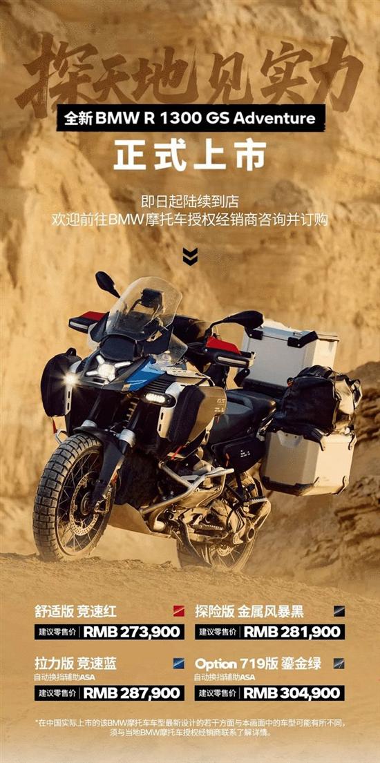 据官方消息,全新BMW R 1300 GS Adventure于国内正式上市,新车共发售四款车型及配色,分别为舒适版(竞速红)售价27.39万元;探险版(金属风暴黑)售价28.19万元;拉力版(竞速蓝)售价28.79万元;Option719版(鎏金绿)售价30.49万元。其中后两款车型,首发搭载了宝马全新开发的ASA自动换挡辅助系统,可以有效降低驾驶疲劳,给骑士带来更加舒适从容的驾驶体验。