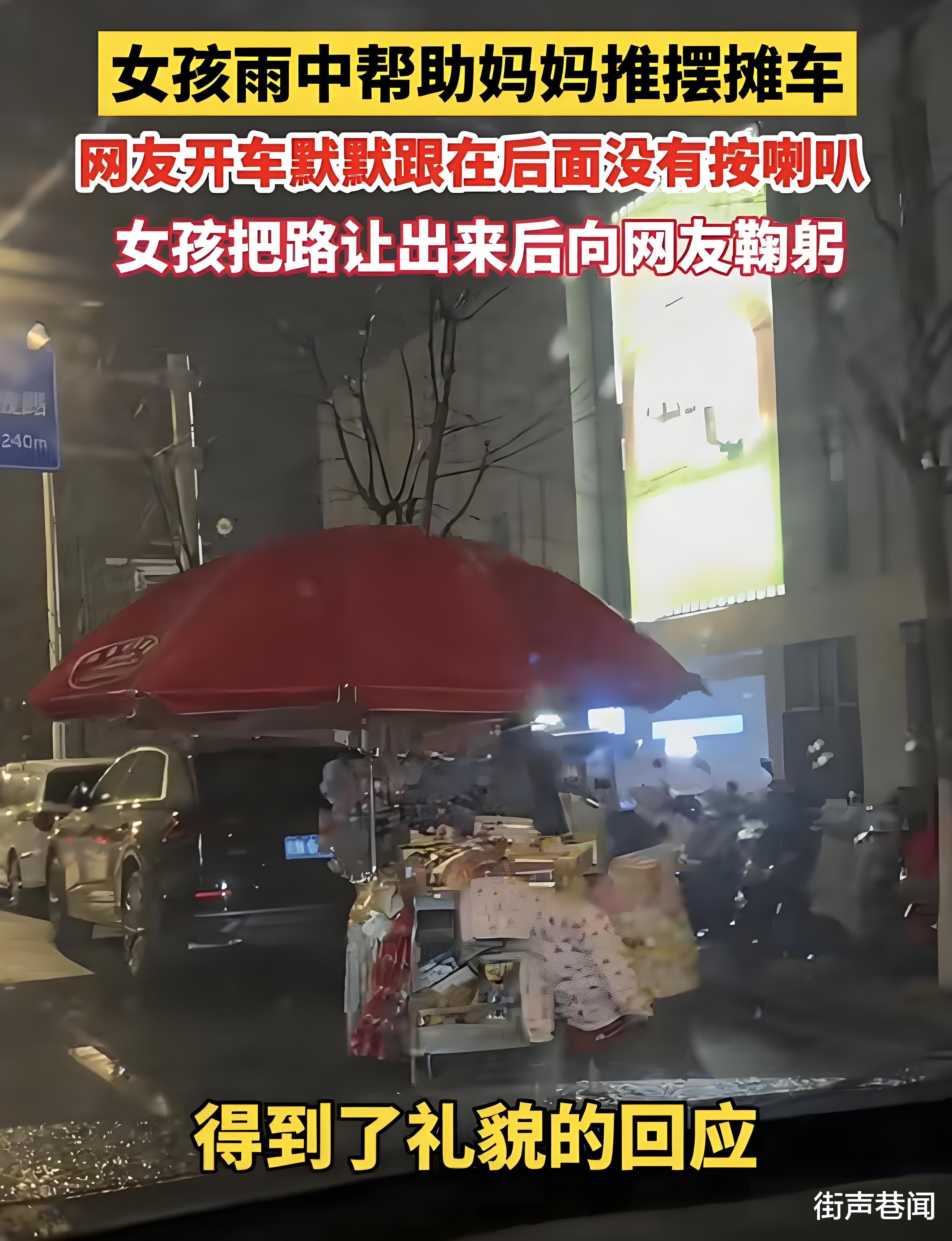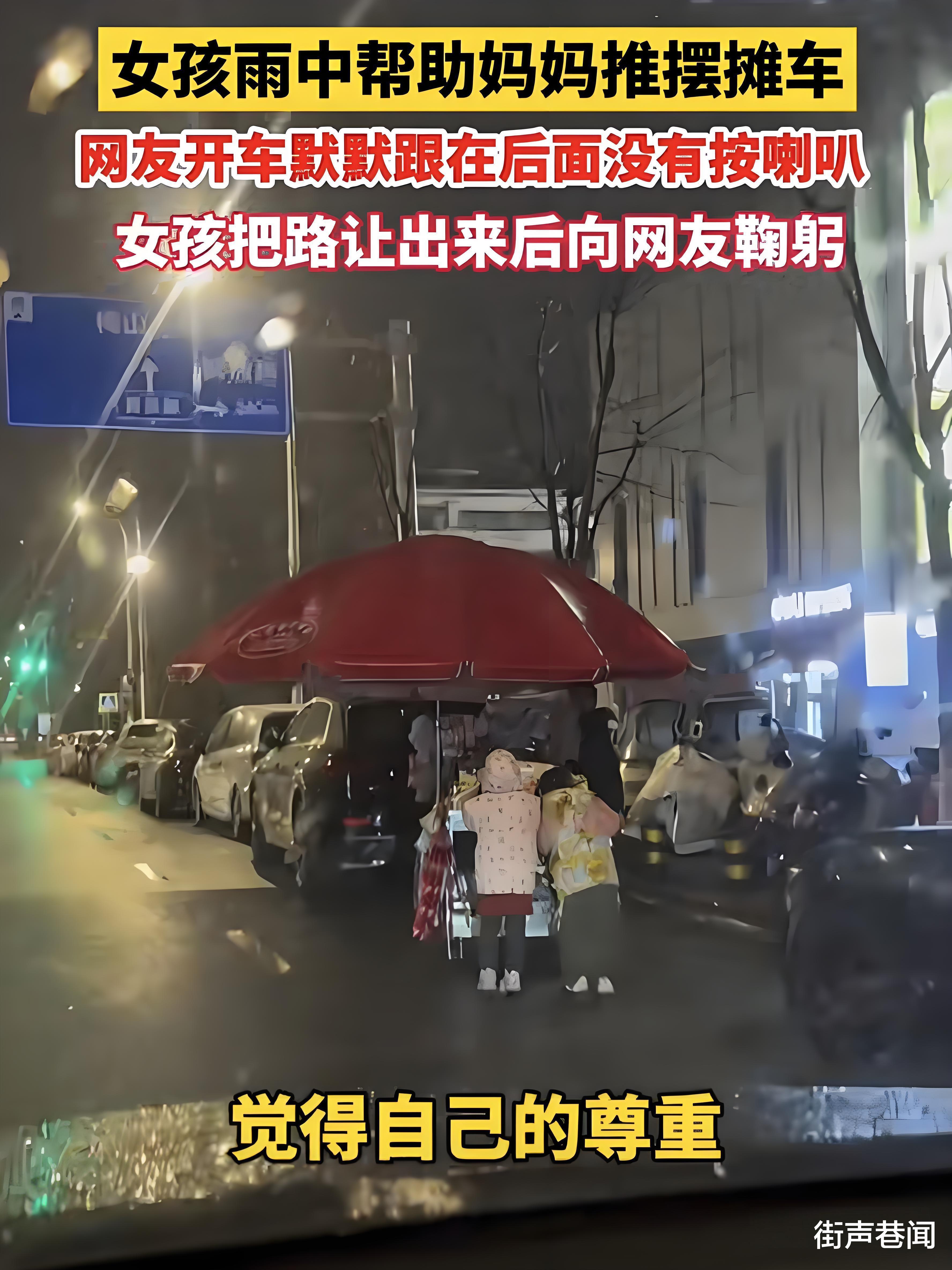 终于,妈妈找到一个空车位,将地摊车推到路边让出道路。当男子开车缓缓驶过时,其中一个小女孩突然转身,对着车窗内的男子深深鞠了一躬。