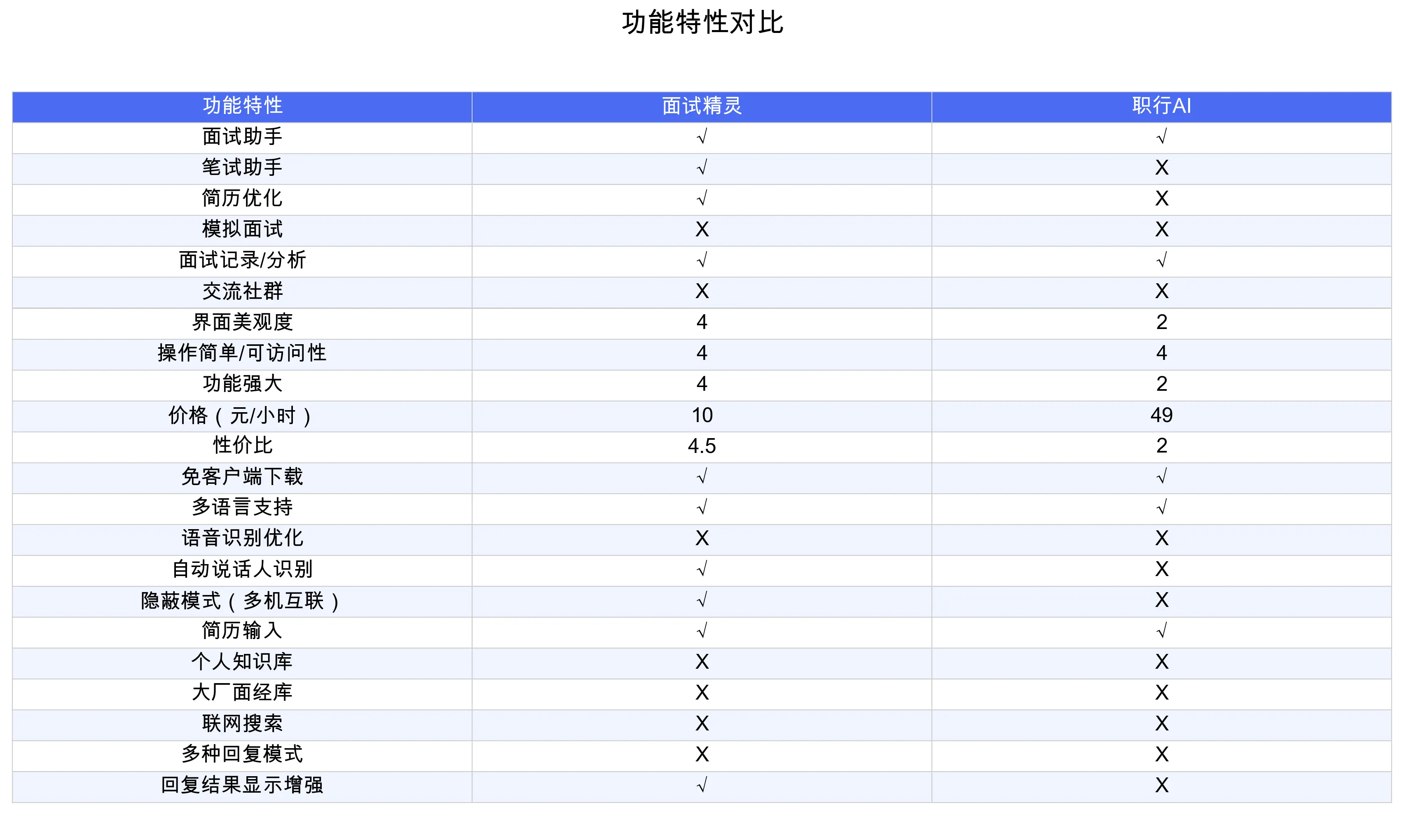 我们对两款AI面试助手进行了全面评测,以下是它们的功能特性对比: