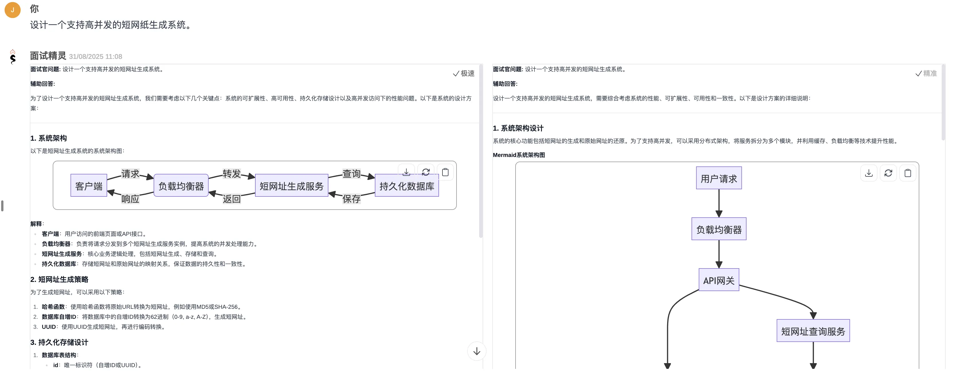 两款工具都能给出正确的系统设计思路,但面试精灵在架构图的显示效果上更有优势,能够帮助面试者快速抓住重点并理清回复思路。