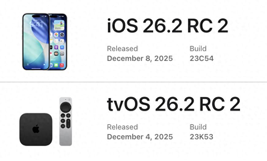 按照苹果以往的更新节奏,原本预计 iOS 26.2 正式版最快会在今日到来,但今天凌晨苹果发布的并不是正式版,而是 iOS 26.2 RC 2(第二个准正式版)。同时苹果也发布了 tvOS 26.2 RC2,其他系统并未获得更新。