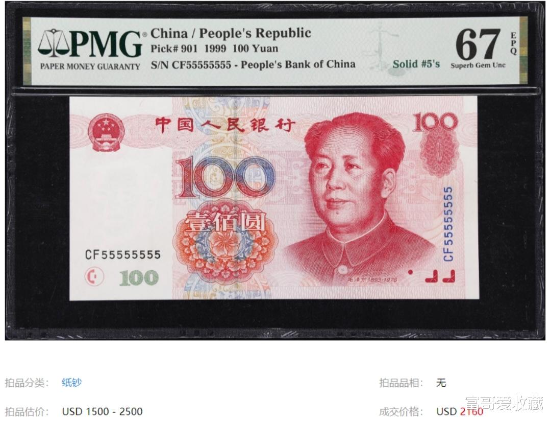可以看到,上面这张1999年100元纸币,它的数字号码全是5。